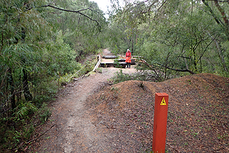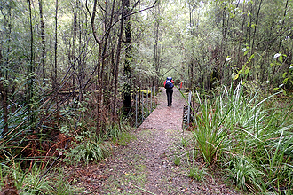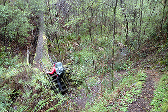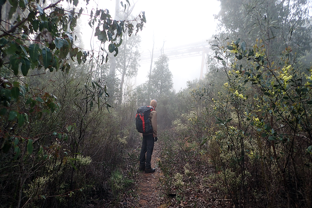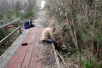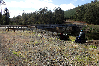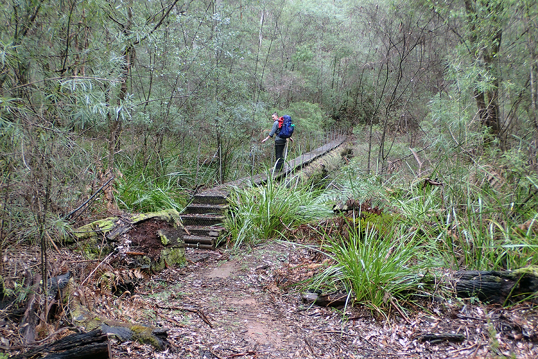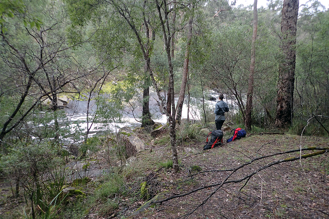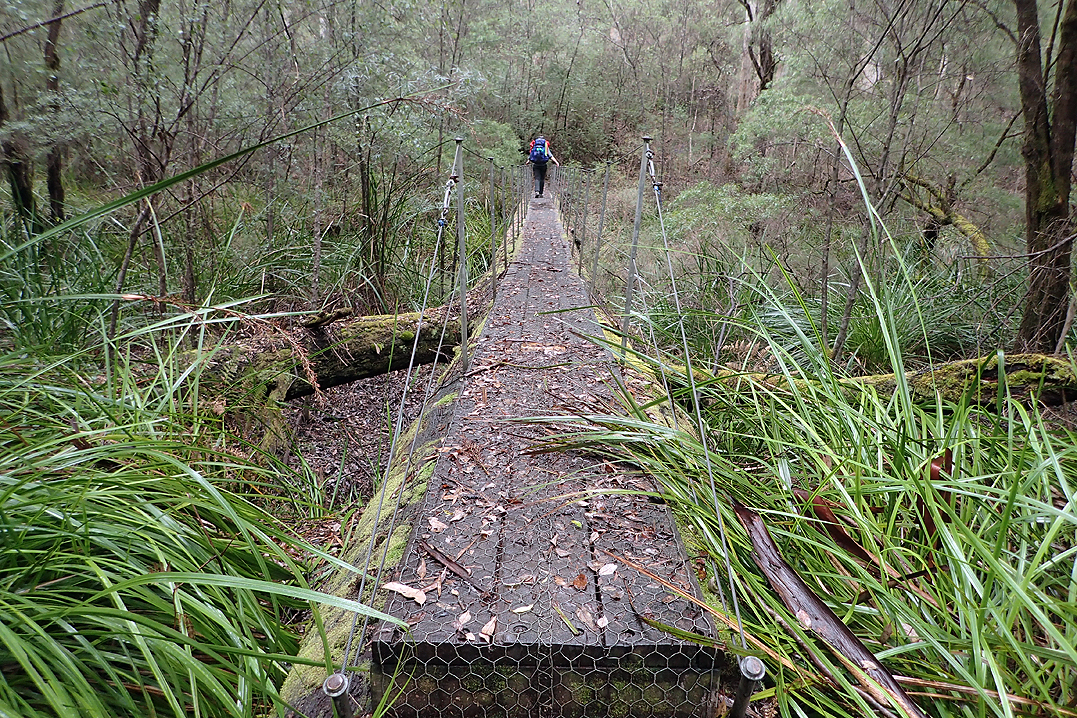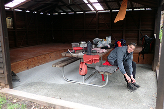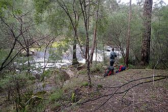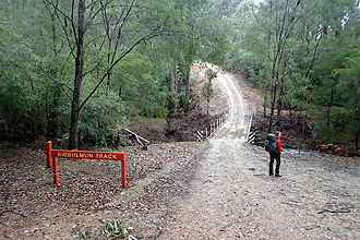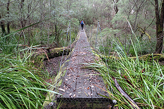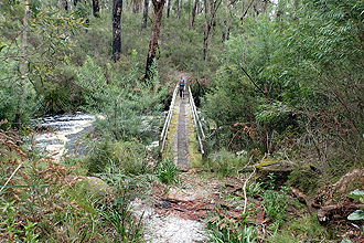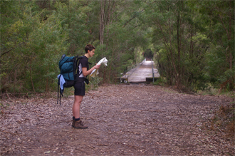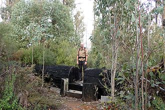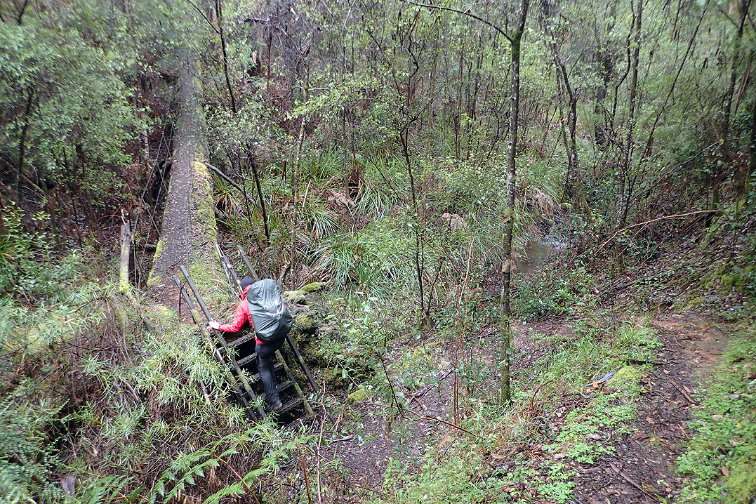 Reading through the entries in the Dog Pool Hut book, it seemed the hut was inhabited by ravenous rodents. They would chew holes in your pack or tent indiscriminately, no matter if you hung your pack and food separately. Previously if we used a hut we would hang our packs with everything inside, keeping everything out of the tent. Copping a holes in a pack pocket is one thing, but a holes in a tent spells "Death to Rodents". The hut is on a beautiful spot on the Shannon River with a long bridge over to the road on the other side, so we thought we would just pitch our tent on the path over the river and totally outsmart the buggers. In the morning we woke up to a hole chewed through one of Mike’s pack side pockets. He had left four nut bars in there. The rat chewed through the fabric, got into the wrapper and ate an entire bar, leaving the other three behind. You had to praise him for not being a glutton. Especially since on this section we ended up being a little light on snacks.