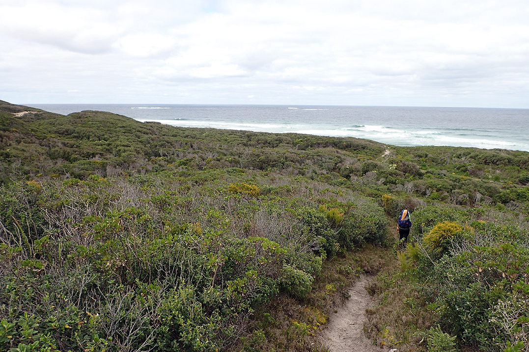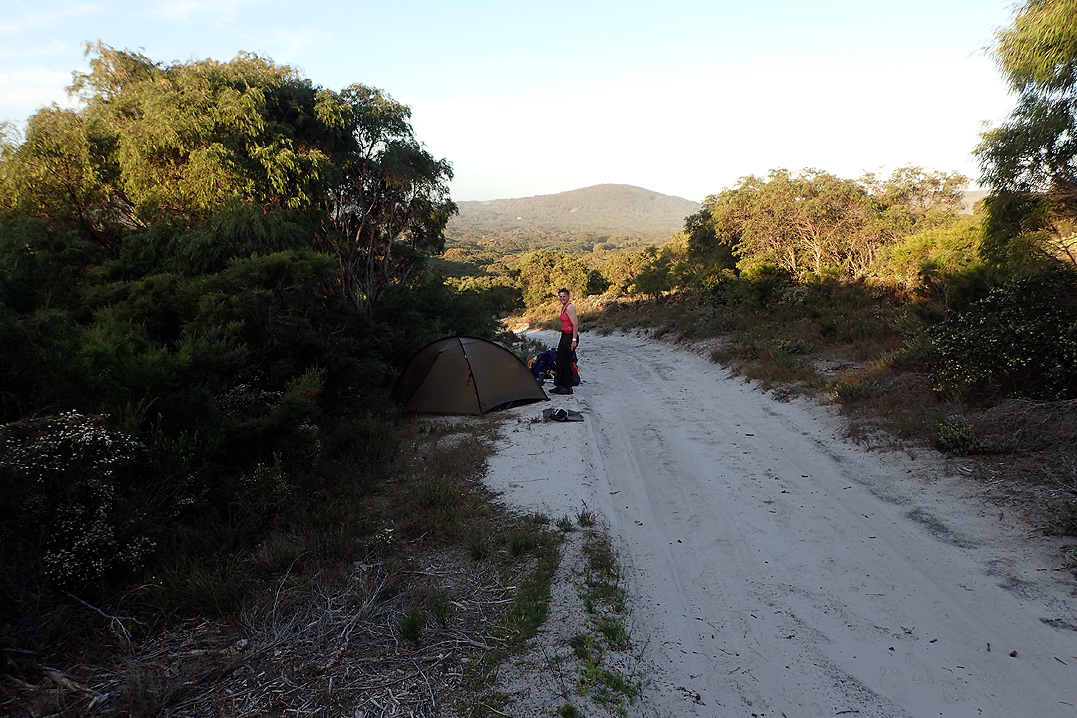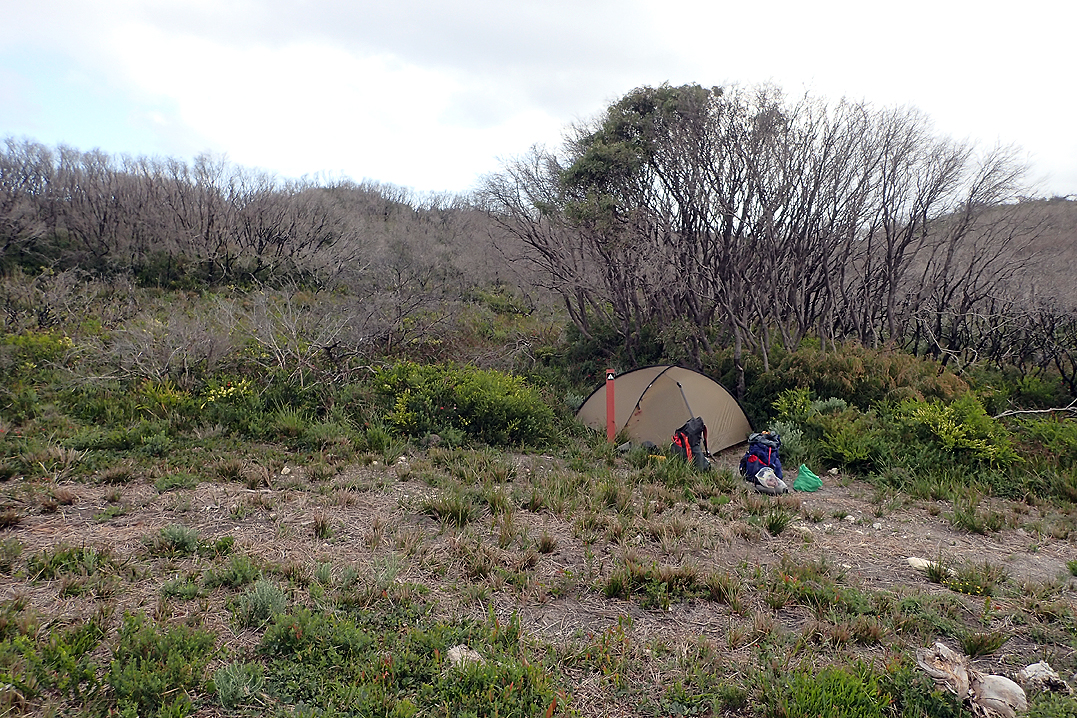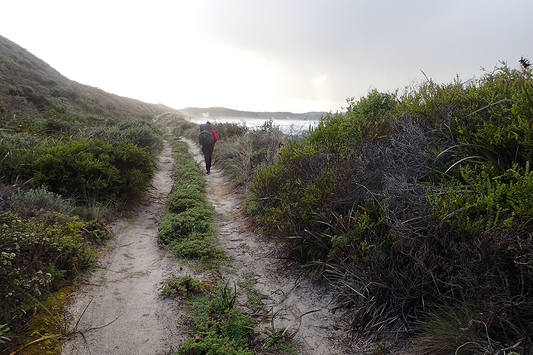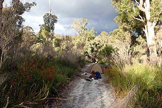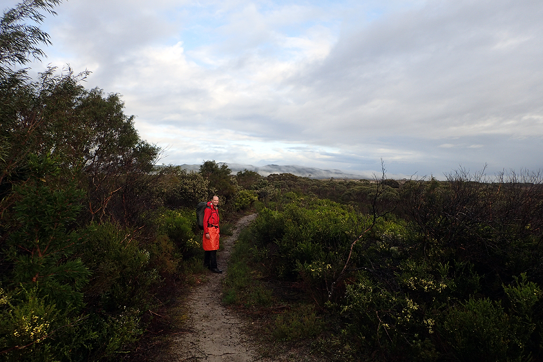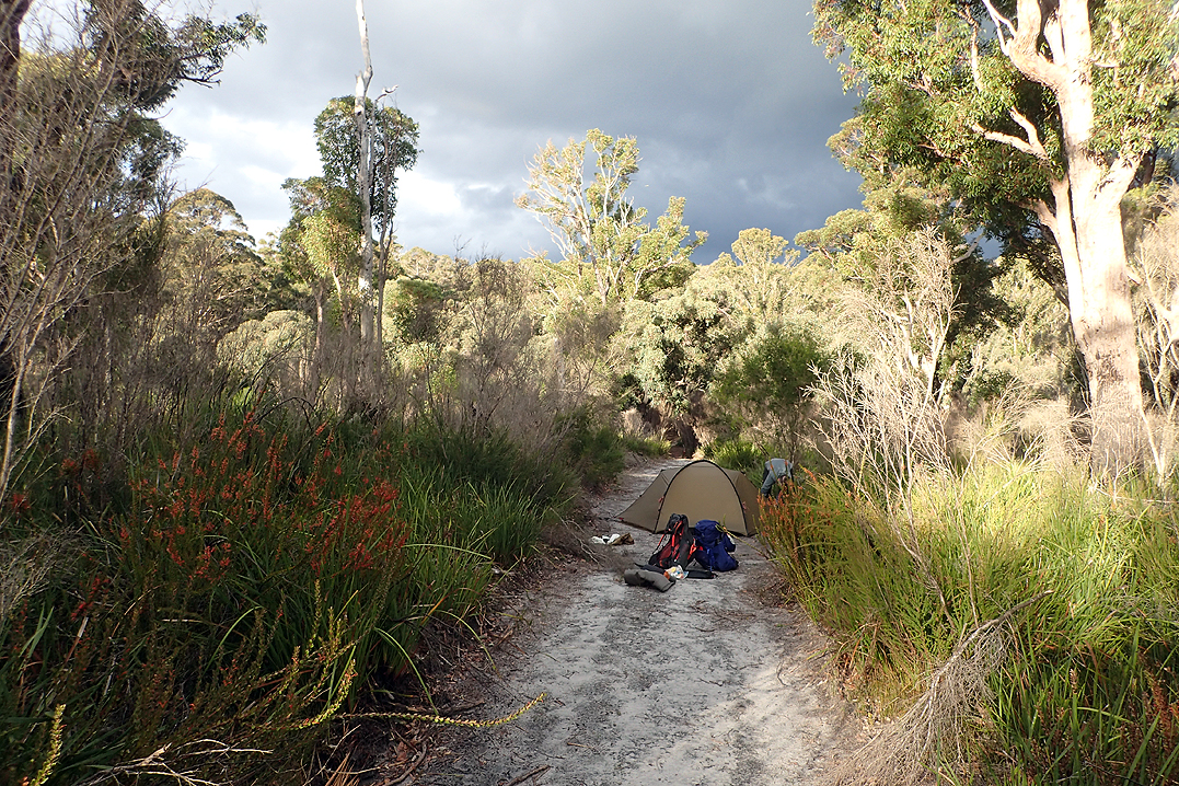 This part of the walk is back in the trees, and to be truthful we had had enough of that. We were keen to get back to the coast. We lunched at Giant’s Hut and then kept going really to a point where we were on the sandy coastal plain again. We pushed the weather as far as we could and got the tent up just as the rain came in.