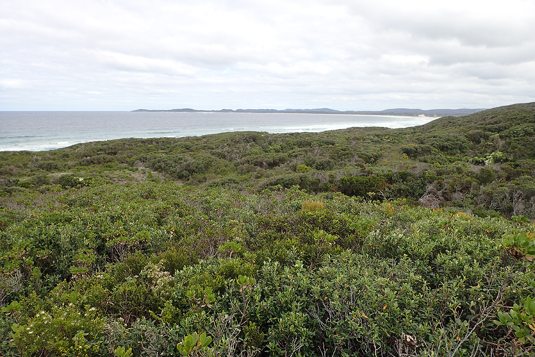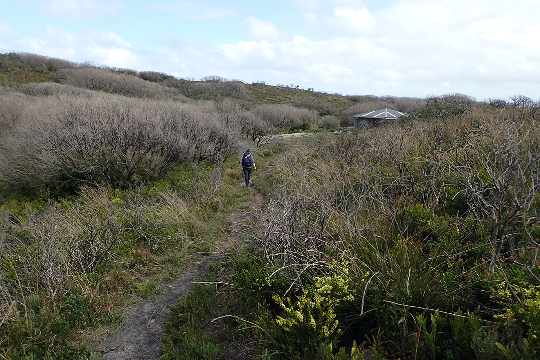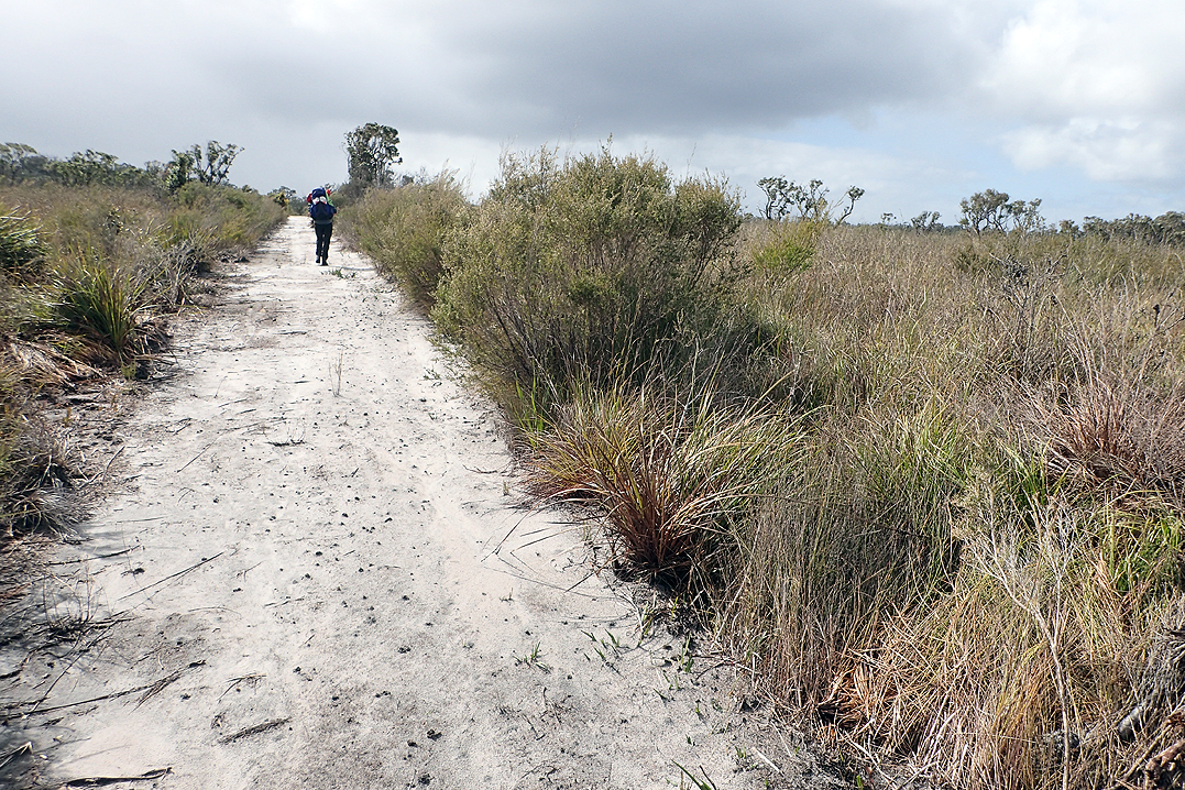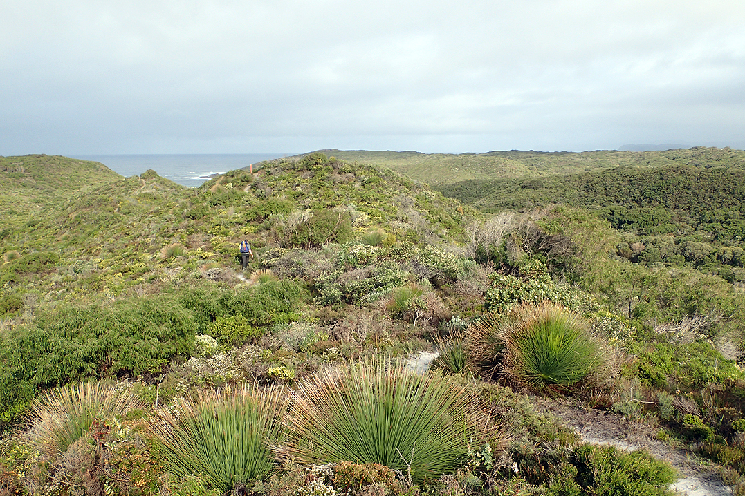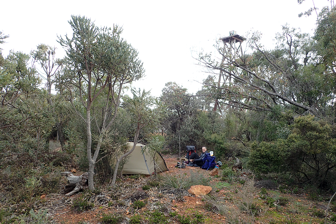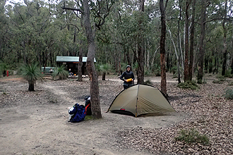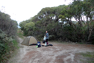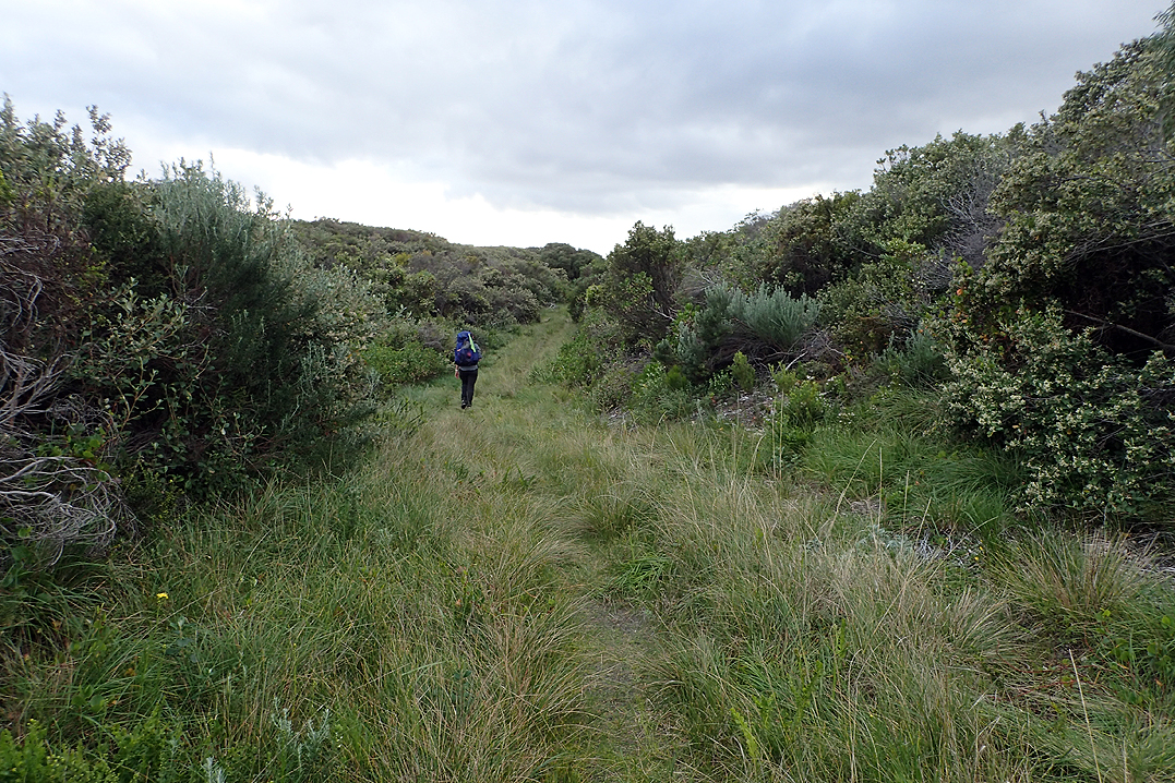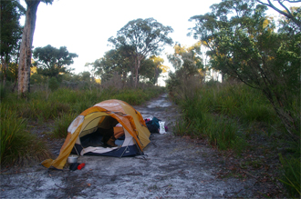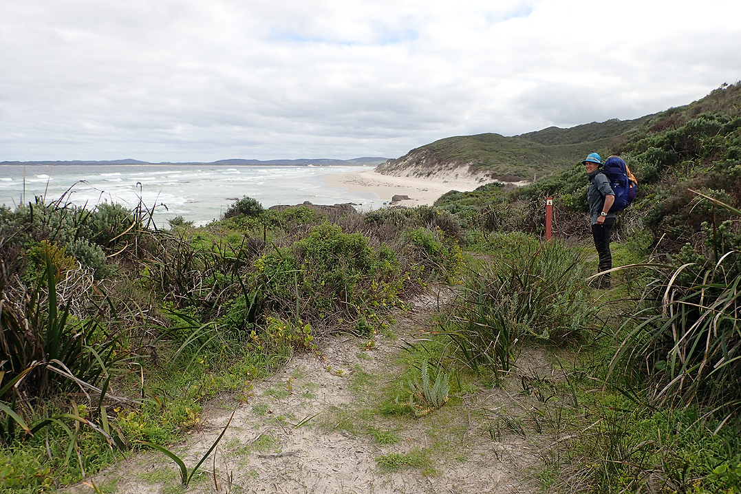 This part of the walk is back in the trees, and to be truthful we had had enough of that. We were keen to get back to the coast. We lunched at Giant’s Hut and then kept going really to a point where we were on the sandy coastal plain again. We pushed the weather as far as we could and got the tent up just as the rain came in.