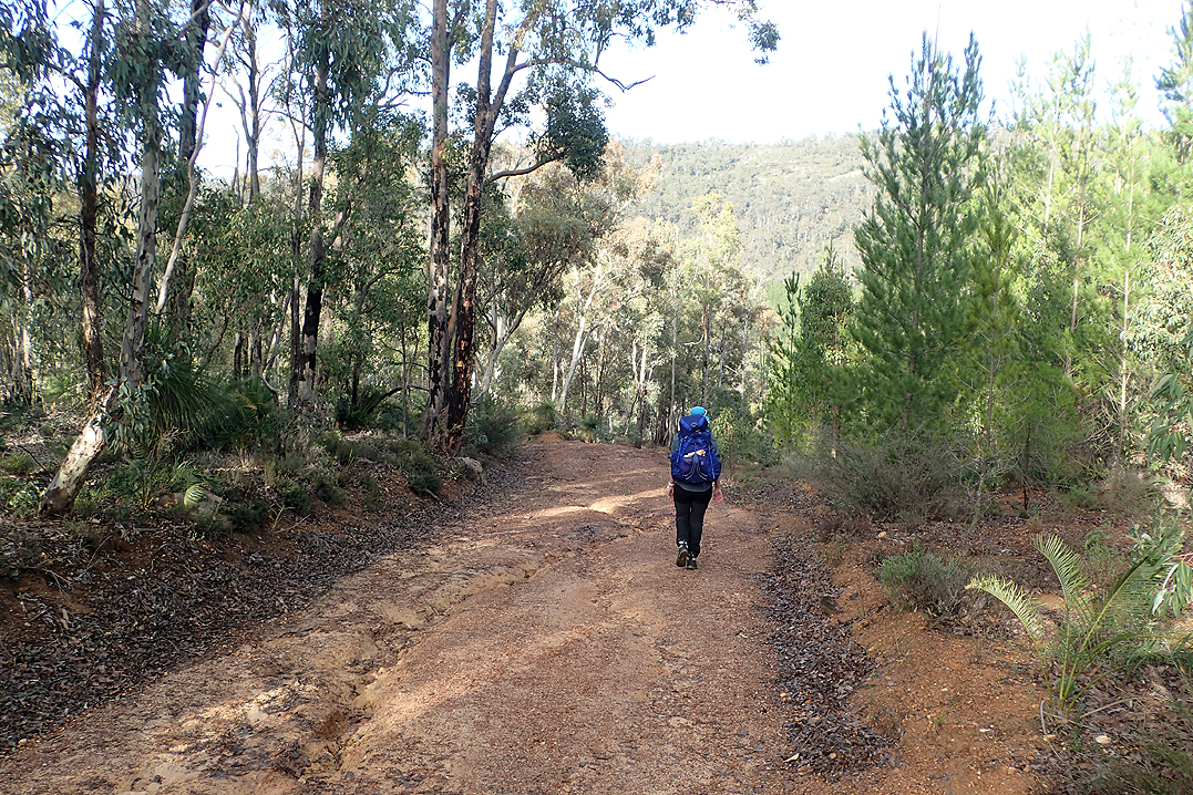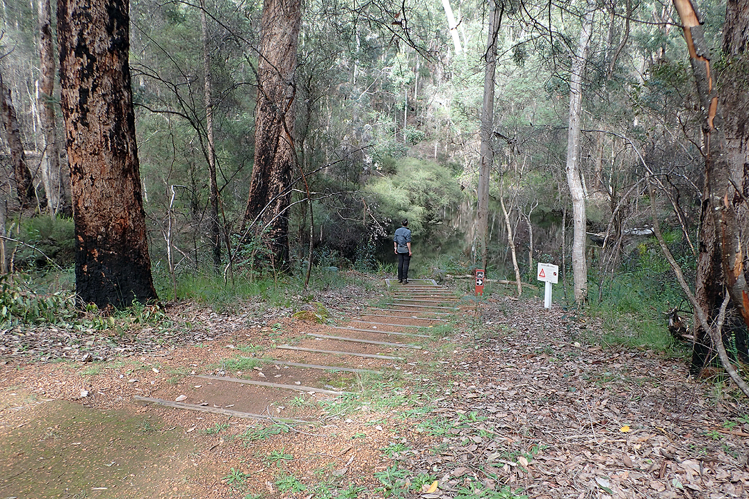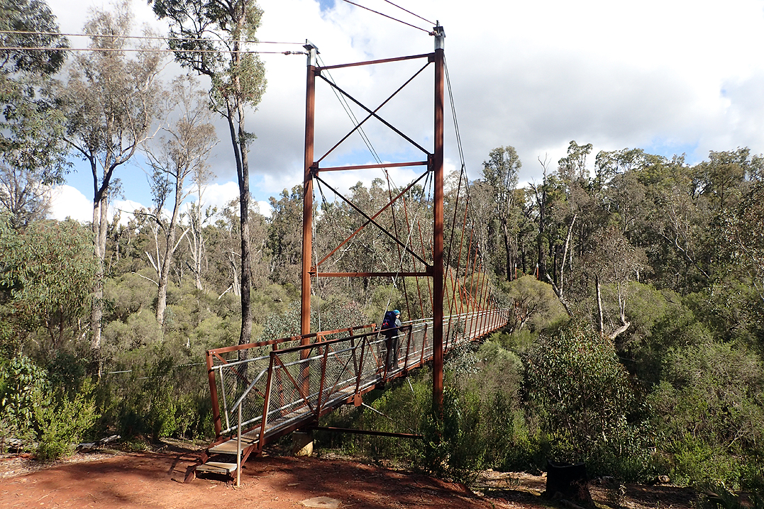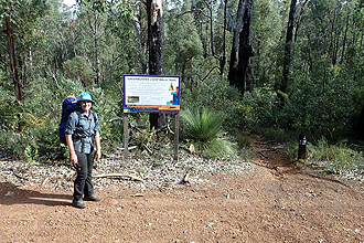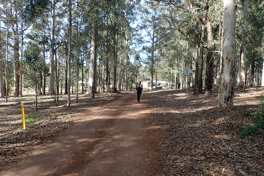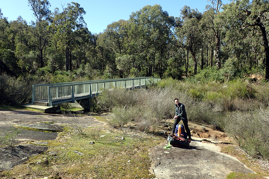 We caught the bus from home to Kalamunda and it was a 2 min walk from the Kalamunda Terminus to the start of the trail. It was a busy, warm Saturday. The trail leads sharply downhill from the start and is fairly rocky and twisty. We were surprised to see little rivers flowing and wild flowers. Our packs were heavy but manageable, but we were disappointed to miss a turn off and add on an extra 1.5 km to the day! Pretty soon we had crossed Mundaring Weir and passed the Hills Discovery Centre. We met a Bibb Vollie (volunteer) who advised us to take a rest day at Dwellingup but not at Collie as most people who have a day off at Collie bail! At this point we had only Dwellingup on our minds anyway as our first goal.