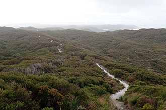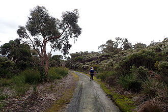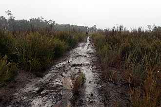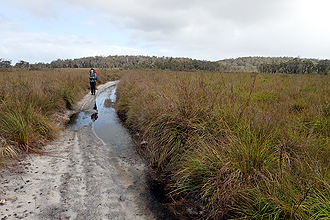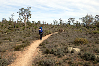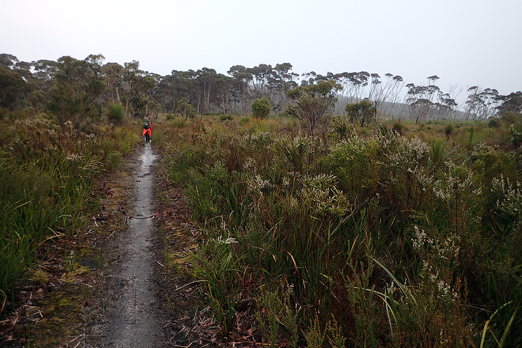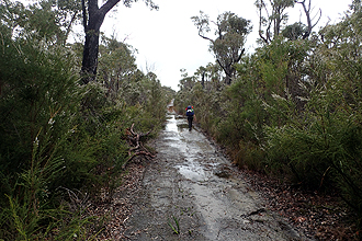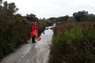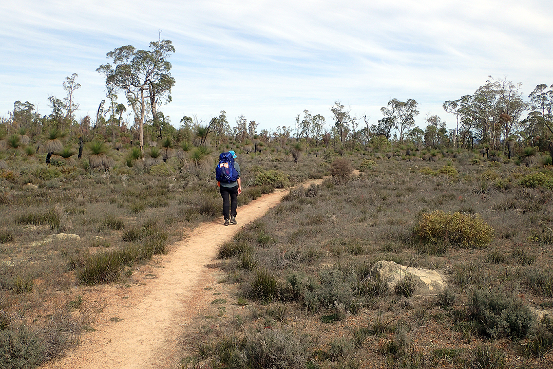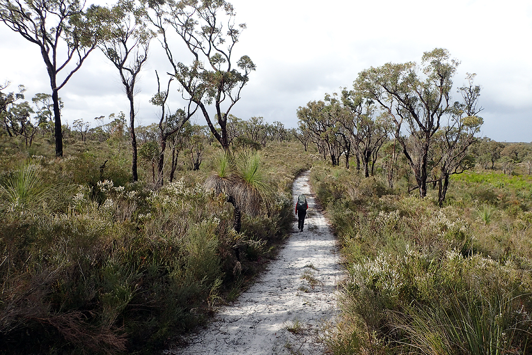Today's walk introduced us to wading through puddles! The path was often inundated by multiple pools which were difficult to get around and deep enough to require the removal of boots, socks and pants. Luckily this entire section is across sandy plains so it is comfortable under foot, especially when you can’t see the bottom through whiskey-coloured water. The water was usually cold and the pools were full of tadpoles. The frog chorus is the sound of this section, it never leaves you, from the sentinel frog who waits by the path and emits a warning to the rest, to the sound of hundreds croaking together. Day and night. The track passes through the beautiful D'Entrecasteaux National Park.