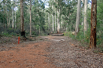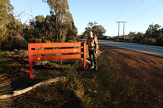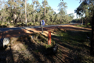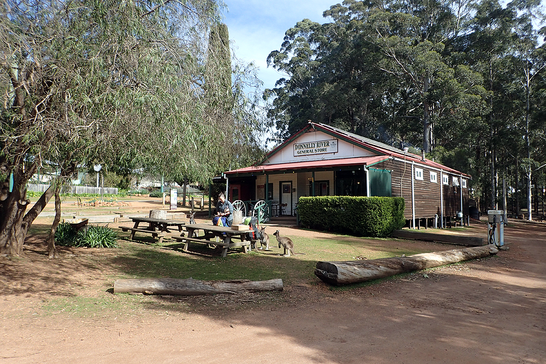 We were so excited to get into Donnelly River Village that we really sped along and then it was pretty disappointing. After Ballingup we were expecting another nice place with a good spot to sit and eat and so on. It is a pretty interesting place. It is an historic timber mill site and we had a food parcel delivered to the general store. The thing which made a bad impression was the crowd of tame kangaroos that made a beeline for you and your hiking pack and sort of sniffed at you to get food and then once you evaded that lot to go try to eat your lunch at the fairly windswept picnic area the horrible emu’s with their big beaks were all over you wanting to peck at you. We packed up and left as soon as possible.