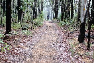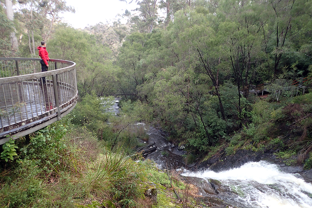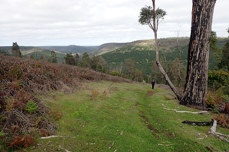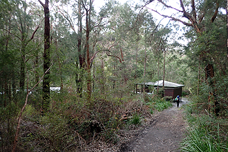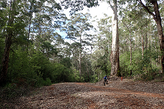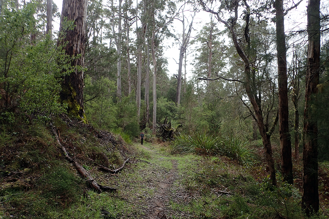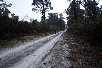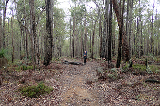 This morning we suddenly came upon the sign indicating we were halfway! The next two days would be tough, unbeknownst to us we had arrived at the "Rollercoaster" which is what people who do their pre-reading on the Bib before doing it, call the continual steep up’s and down’s from here to Pemberton. For us this was made worse by heavy rain which started just after our lunch stop (at Boarding House Hut) and an encounter with a crazy kangaroo who wanted to attack us until Mike showed him who was boss with the help of a large tree branch. Large being relative in this part of the world!