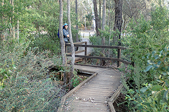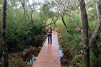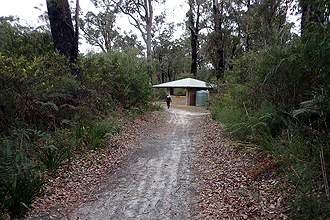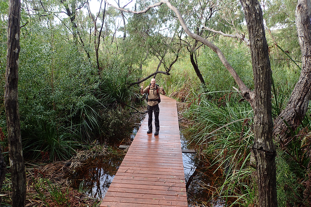 Shortly after the descent we found ourselves in the suburbs of Denmark and then reached the Denmark Nornalup Heritage Trail (the track went along this a couple of days ago also). This was a VERY flat walk for 10.7km. There were a few shelters along the way for day walkers to use. It was a lovely experience which required almost no effort beyond putting one foot in front of the other. It ends at Hay River where we swam and pitched the tent. In all our travels in Lapland we have never encountered such determined mosquitoes. Sitting in the tent the air seemed to vibrate with them. I opened my tent door about 10cm to get some water and about 15 flew in in 10 seconds! Then Mike took his watch off and a cunning tick hand had crawled under his watch strap and had a lovely feed all day and was as fat and swollen as, well as a tick.