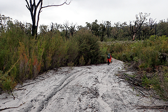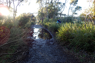 There was a hiker in front of us with a track name of Shoots. He had a walking partner earlier who had had to leave the track and go back to work. As conditions were so wet and the track was sandy it was easy to discern footprints. We worked out which footprints were his and it was somehow a nice feeling to be following them through the puddles. Following in his footsteps made us feel we weren’t the only crazies out there! Apart from Shoots’ footprints, the wonderful scent of Boronia’s which had started to bloom along the puddle edges carried us through.
