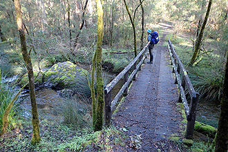 Happily we had no rain overnight and the first obstacle this morning was, yes you guessed it, running the fallen tree gauntlet again. We had started to find that our feet no longer recovered overnight to their usual state. For the first week or so, even though your feet were quite sore and tired by the end of the day, they miraculously repaired themselves over the 11-12 hours spent horizontal overnight. We were now waking to slightly swollen feet still which were not as nimble first thing in the morning. This, along with the slippery dew, made Mike a bit nervous doing the tightrope walk over the log with each pack. I watched and applauded. Then I scooted across on my butt and promptly fell into the mud again on the other side, this time onto my knees and front just to even things up.