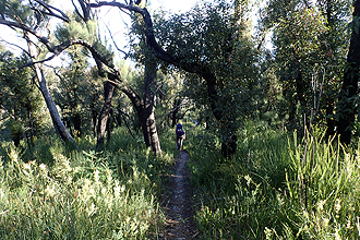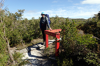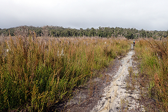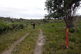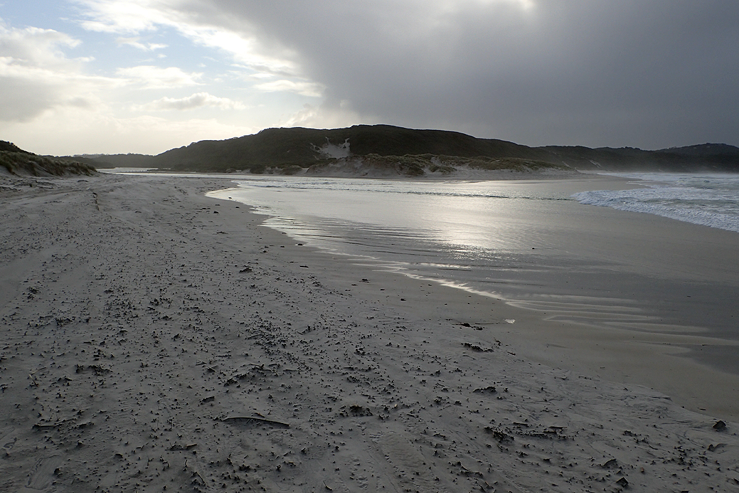 The trail wound backwards and forwards from coast to coastal plain. By lunchtime we had reached Parry Beach where there is a campsite. We walked along the beach for about 1km before crossing the inlet. These inlet crossings are always fiercely reported on in the log books. The descriptions will vary from waist deep to knee deep to head height. The water was flowing pretty strongly from the inlet into the sea but it was only just above knee height and about 10m across. After this crossing the beach sand turned very soft and walking was difficult all the way along Mazzoletti Beach for a further 7km. The sights and sound of the roaring waves made it enjoyable all the same.