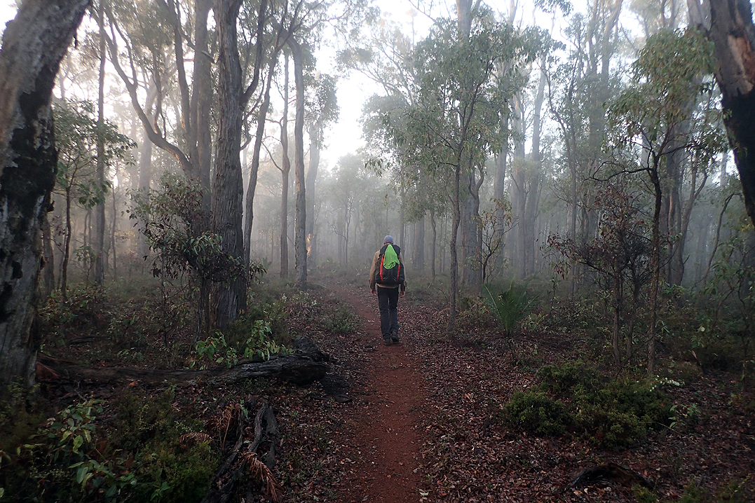 We were starting to settle into our "distance rhythm" by now. For us 26-28km is a good daily distance. Our best advice to anyone undertaking this hike is "Pick your distance. Repeat it day after day after day no matter where it ends up". It was a misty morning. We had heard an industrial sound all night and it was a conveyor belt for Worsley Alumina mine. We walked underneath it in the morning. Many of the trail is bordered by hakea bushes whose yellow flowers seem to be luminous in the mist or in low light. We found this amazing. In normal sunlight they were just a lemon yellow, but in early mornings they actually glow.