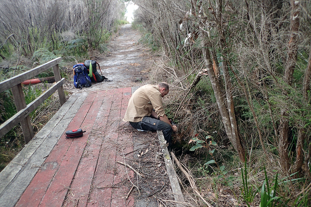 It was getting quite late and we wanted to make the hut by 17:00. Going downhill my foot slipped on a wet log and I fell flat with my legs straight in front of me. It was very painful around my left knee. So just like that my bad knee became my good knee and I had to transfer my knee brace from the right to the left knee. I guess this is what middle age feels like.