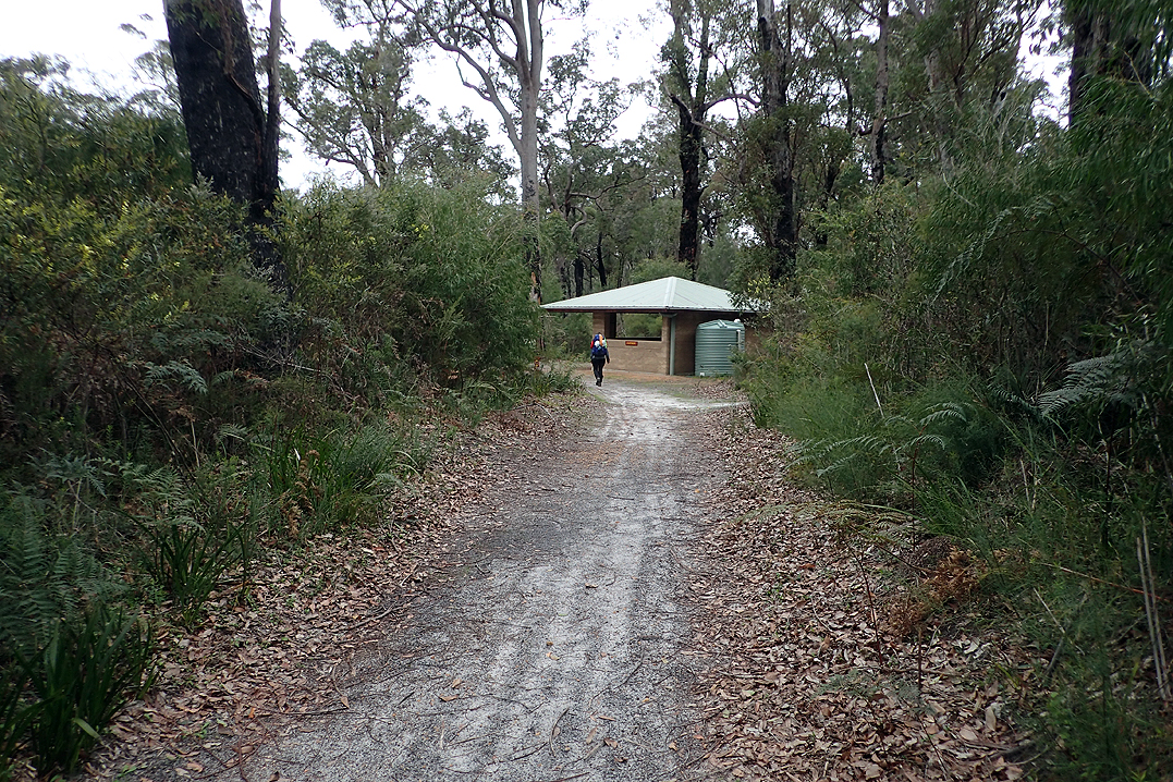 Just after the uphill climb out of Collie we met David and Krishna, whose overseas travel plans had like ours this year been cancelled, they were hiking Collie to Pemberton. We caught up with them again at Yabberup Hut. This is just after the Wellington Dam Spur Trail. There is a group hiking shelter at that point. They were overnighting at Yabberup, as were the three girls from Freo who’s log book entries we had been reading. We found that most E2E’ers would have a day off in each track town or village, which meant that over the 6 weeks on the trail, we caught and passed many of them. It was nice chatting to Krishna and David. We pressed on to Glen Mervyn Dam and experienced our first cloud burst while walking. The dam is set up for informal camping with a toilet. Just a note about toilets. All the way from Kalamunda to beyond Northcliffe there was almost without fail toilet paper available, which amazed us in a bush toilet. They were always in great condition and cleaned regularly. The one at the dam was no exception, even though not a Bib toilet.