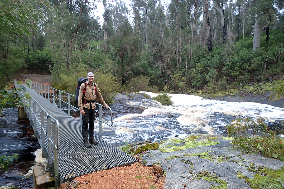 The day was wet and green and steep. The trail wound up and down following the Donnelly River all the way. The river itself was fast flowing and full. We were amazed at the various crossings of the river - one in particular via a MASSIVE felled tree with the one side sliced off to make a bridge. The whole thing just rested on each end bridging the river, complete with hand railings (this is Australia after all!).