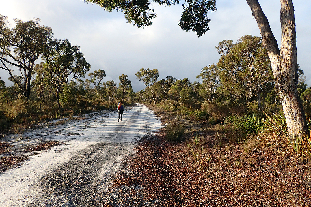We had route options on the day as you could actually abandon the trail completely and use unsealed roads which would not add on distance. The track and roads run parallel but the roads are not subjected to the same levels of inundation as the track. There was a section where we chose the road, but the track is so beautiful here and the scenery of the Pingerup Plains is exquisite, so we put up with the wading. We were still stopping a lot to take our boots off which is a pain as you have to dry your feet properly afterwards and get all the sand off before putting your boots on. It is very time consuming. We were also becoming a bit more gung ho and where possible just legging it boots and all where the puddles seemed shallower. Walking the puddles barefoot could result in very cold feet, especially if they went off for a few 100m or there were multiple puddles.
