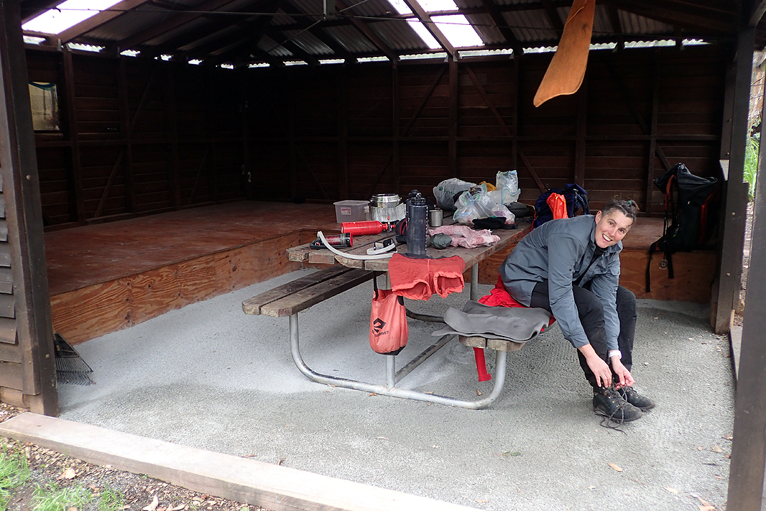 We took a long rest at Ginger Creek. This became a pattern for us. As we do not always camp at a hut at the end of the day and often reach a hut mid-day we would usually take 90 min off at that time and often have our main meal, take off our boots and relax. All hikers carry a tent on the trail as it is supposedly mandatory to do so, but almost none of them use the tent as they choose to stay in the hut. In winter the hut is much colder than a tent. Also, as we learn later, the huts are home to water rats etc. As always, our tent feels like home.