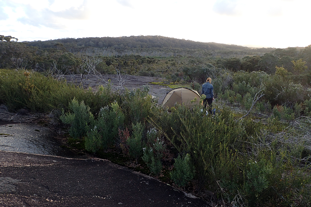 We arrived at Ball Creek Campsite at 16:30 and met Jordy, who had End to Ended (E2E) from Albany and this would be his last night on the trail. He offered us various things eg. A herbal tea which you could also smoke and would help you relax?! We declined, best not to try something new at this point. Kim was also camping at the hut, having walked a few days in the local area. They sat up late into the night talking at the fire,burning a dead grass tree which lasted for hours. We hit the sack in our new tent after inflating our new Nemo mattresses which seemed impossibly light (and proved to be just that) and lowered ourselves gingerly onto them.