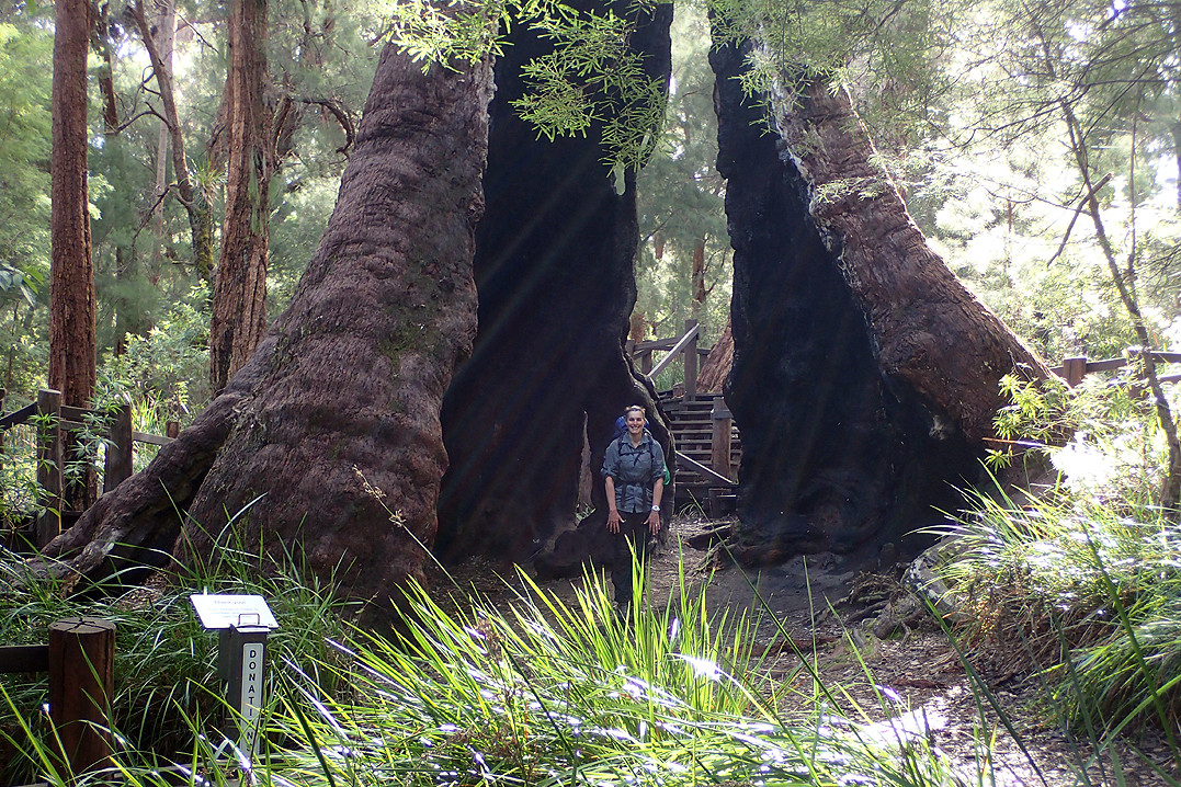 Leaving Walpole was just as good as arriving. Passing the inlet we spied an outdoor shower at the toilet block by the beach. Winner! We jumped into our swimmers and had a bonus cold shower. We had a bit of an uphill walk to get to the point where we would descend to the Frankland River. It was lovely being amongst the giant Tingle trees. These trees only grow around Walpole. They survive fire by allowing their insides to burn out and the tree still lives on the outside. For this reason you see many hollow trees but they are flourishing.