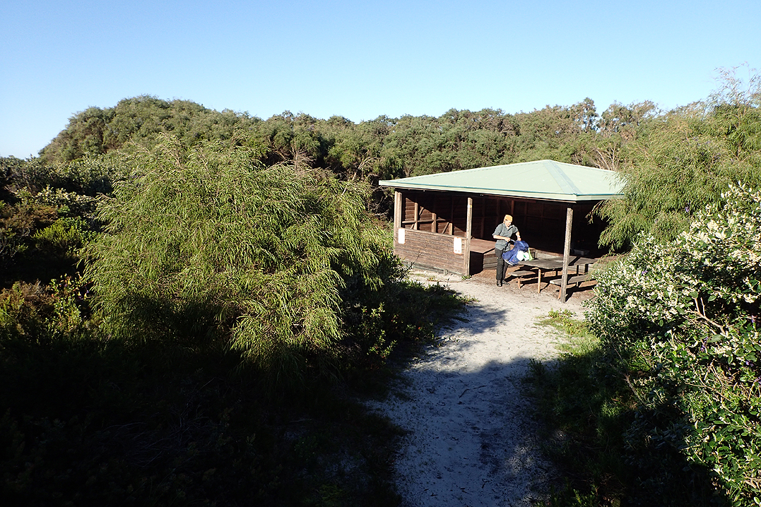 At the turn off to the Lake the diversion route marker along an unsealed road was uncovered so we were not sure what that meant. Were we supposed to take the diversion? Or could we still reach the hut? We were thinking that the route to the lake could be flooded. We are worried about this section as on our map there were no warnings about seasonal inundations as there were further on through this section. We had met people who told us scary stories about the crossing of the Pingerup Plains. Usually they entailed phrases such as "waist deep water" or "chest deep water". At which point the bloke telling you this would hold his hands along a line about chest height for emphasis. We decided to follow the route as normal and hoped for the best. It was fine and the hut by the lake as well as the lake were beautiful. I arrived with my pants off as somewhere during the day I had grown tired of putting my pants, socks and boots back on after wading so I just left my pants off.