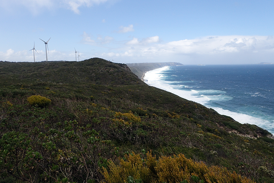 Good weather again for our walk on to the sandy beaches. Every part of the trail takes you through different flora and the wildflowers come and go, always something different. The coastal views were beautiful and there was no one else around. We got our first glimpse of the Denmark wind turbines along the headland. We had another food parcel waiting for us at Peaceful Bay Caravan Park.