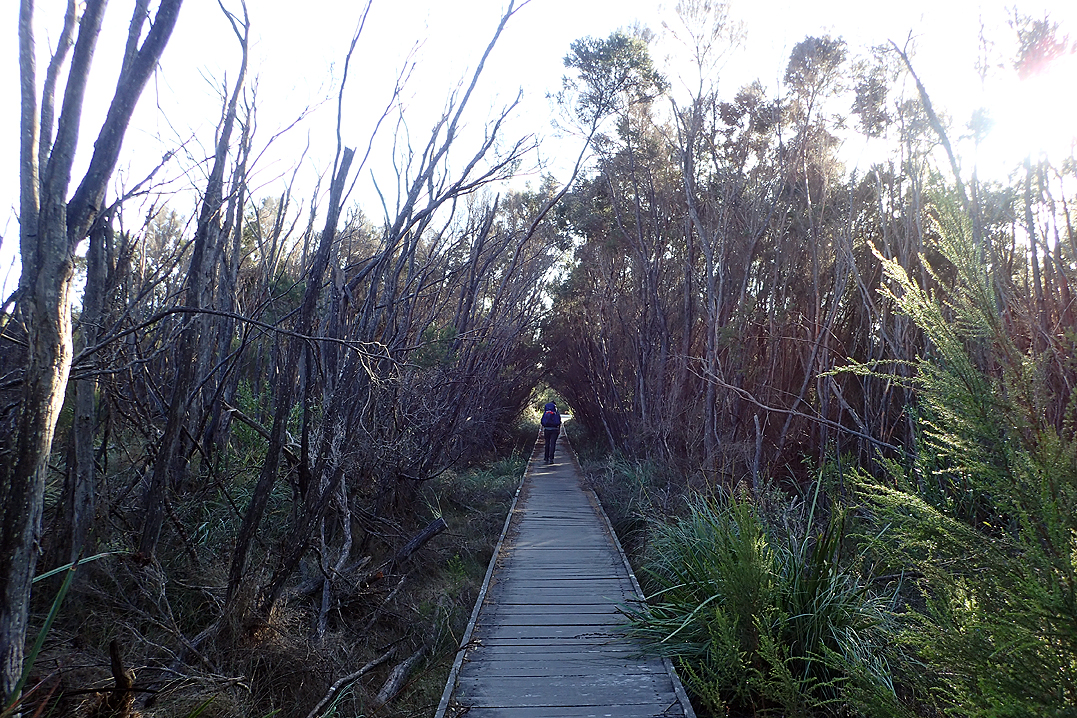 It was a short 10km walk into Walpole and passed through Tingle forest and passed good view points. The last bit was over a boardwalk and after crossing the river you emerge into the picnic areas that run along the main street. We were very impressed with Walpole. We probably liked it more than any other track town. It had a good feel about it and when walking through the suburbs the houses were all really neat and well presented. There does not seem to be much new development which the bigger towns had and was not always well done. We had run low on supplies from Northcliffe-Walpole and had started to fantasize about all we would buy and eat when we got there! The supermarket was brilliant and we did indeed buy a lot of food and eat a lot of food! We sat in the sun at the visitor’s centre at a table and benches and stayed about three hours. Whenever we are sitting in the sun long enough we would whip out the solar panel and charge the phone, camera and the Kindles. We also looked at the route to come and worked out how much longer we had to go. We had already revised our trip length from 49 to 46 days. Now we realised we would complete it in 43 days (including one rest day). We decided to book our flights home from Albany to Perth and after that we realised it was all locked in and there wasn’t long to go.