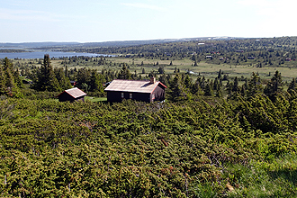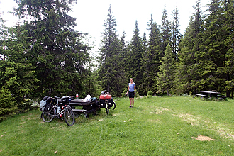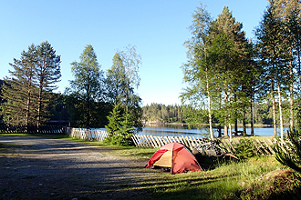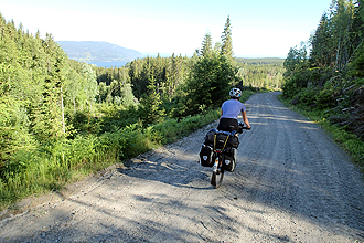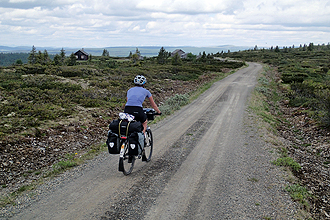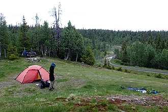 The climb started at Lillehammer and we had the benefit of a cycle path for the first few kilometres. We were then up in the forest, climbing higher and higher. The views over Lillehammer were amazing. The climb would ultimately last 20 km. We passed the turn off to the ski jumps, then to the ski course, the ski huts, then to where the buses turn around. Still climbing. We reached Nordsetter and had a great rest and snack at a picnic area and then kept climbing. Norseter is all about ski-ing and there are many lodges and huts catering for the winter trade. Eventually the route became an unsealed toll road and we climbed still. We were tiring now and although it had been overcast when the sun came out it was hot. The area itself is very beautiful, all coniferous forest with grassy floors and lakes and you can see for miles and miles. We passed some rivers which were camping options but kept going. We almost stopped at one, but it wasn't quite the right spot and came across two ladies on bikes out for perhaps a short tour (very light gear) one of whose bike's could no longer engage the chain by pedaling. This is a problem that would end a tour! We had just come through the settlement of Hornsjo and she was on her way there to see if she could get any help. Amazing to come across two ladies not very geared up in these remote parts. The very next river was perfect, flat place to pitch and a bench! Pity about the MANY bugs but we still managed to spend time outdoors fully covered, and with hats and flynets. Norway is a beautiful challenge!