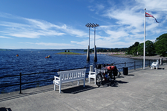 Our flight to Oslo left Heathrow a little late at 4:00 pm and arrived in Oslo at 6:35 pm. By the time we had collected luggage, cleared the airport and put the bikes together it was nearly 9:00 pm. We bought something to eat at the airport and were reminded of how expensive it is just to stay alive in Norway! We had a 5 km cycle to our hotel, all along perfect cycleways and had a great night's sleep. So great in fact that we stuggled to be awake enough to get to breakfast at 9:00 am. We ended up making the most of the hotel and checked out at 11:30 am. We had to remind ourselves which side of the road to ride on! The weather was absolutely perfect and the route was wonderful. Along the flat, dedicated cycleways for 40 km! Fantastic. We were using Cycle Route 7 but would not necessarily continue on it. We had some housekeeping to attend to; drawing money, buying petrol for the fuel bottle and of course buying food as well. What a different the weather makes though! You don't crave the same foods and this is easier on the pocket in Norway.