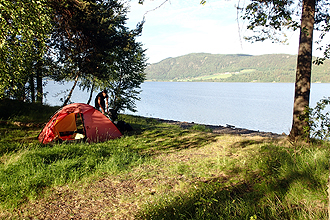 We continued along the dirt road with quite a lot of climbing but almost all rideable, except for when I couldn't go up and couldn't stop, and promptly fell off my bike and then even off the actual road into the channel alongside. No damage done. The weather was warm and beautiful (can't say how much we appreciate this, remind me of that when I start to complain about the heat in a week's time) and the route was very scenic. We had great views all day of Mjosa Lake which is the largest in Norway. So blue sky, green forest, blue lake. We even rode through our first herd of Norwegian sheep, complete with bells around their necks; free range sheep maybe! The dirt road ended in Espa after 15 km and we continued along great roads to Hamar which was fabulous. It is a town right on the lake and has many beaches, diving boards and water activities. We sat on a bench with many sun-loving Norwegians, all with their faces to the sun. We were the only ones with hats on, as usual. We had lunch there and a local chatted to us sharing some good local knowledge about our route. We could not wait to get into the lake ourselves! We continued to ride along it for a few kilometres and then our route took us away from it. We had a campsite we could use in Brummunddal, but 5 km short of it came to the turn off for Verven Badde which is a series of swimming holes on the lake. What a spot! We relaxed there all afternoon, swimming in the cool water when we got warm and reading. Norway delights. As I write it is 9:30 pm with the sun still high, and we are still to pitch the tent. Feels like a summer holiday!