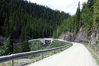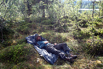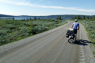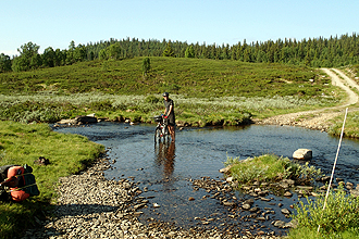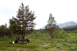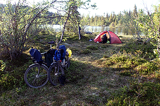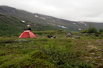 We chose the perfect day for a rest day as it rained almost all day so it was good not to have to cycle and also cool enough to be comfortable in the tent as the midges would have made it too difficult to be outdoors. We had a very restful day as we were no longer worried about rising river levels! The area where we camped was surrounded by a very pale green, almost white type of lichen/ground cover which was soft and very beautiful. There were also large piles of animal pellets so it seemed that elk came down from the hills behind to graze and drink from the stream. As we were there however they wouldn't have come.