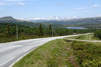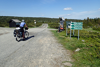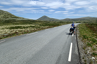 So today we were to descend 800 m to Ringebu and then climb 800 m to the Rondane. We were about as excited about it as you would be! It breaks the heart of a cycle tourist to lose all that height only to have to work at regaining it, but there was no other way! We had a great start to the day and the descent took about 15 min and 16 km. It was great, not too steep until the very end. When we got to Ringebu the plan was to stock up on food as once again we did not expect to pass a shop and we also wanted to have a rest day up in the Rondane. It was a Sunday and we had forgotten that there is no Sunday trading in Norway! Everything was "stengt". Mmmmm, the old fallback is the Statoil petrol station where you pay a lot more but there was a good enough selection. We had a second breakfast and off we went. The climb started with some crazy short switchbacks and we had a cycle path for a bit, then we turned right onto the climb proper. The road is a national tourist route called the Rondevegen. It climbed quite steeply and soon the valley floor with it's glassy lake dropped away. The climb was steeper and more difficult than the one at Lillehammer. We climbed solidly at a gradient of 9% for over 2.5 hours. At one point we had stopped in the shade at the side of the road and three guys on road bikes passed us. The road was quite busy with weekend traffic. I was mostly surrounded by a cloud of flies as my speed was so low (sometimes only 4km/h) and I was dripping with sweat. It was hot with the sun out. We climbed above the tree line and reached our maximum height of 1057 m and then came to a massive Kiwi Pris Grocery Store - "Apent"!! What a bonus; you can always buy more food! We stopped and went inside. The three road bikers were there too and we had a long chat. They were all from Oslo and had set out from Ringebu this morning. They were meeting their family about 85 km further on. It was nice talking with them. They assured us the remainder was "basically flat".