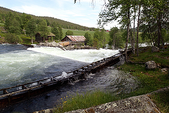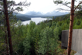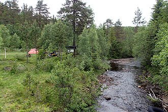 It was lovely being up so high surrounded by a wide flatlands and no trees, just ground cover. Many people were sitting at the picnic spots along the way. We had a long descent again, speeding along a river's course. The road was great. We stopped at an old water mill for lunch at about 3 pm and had a sleep. After this the road undulated gently, more down than up, beautiful forest again and we stopped at a scenic lookout. The Rondane mountains are beautiful, many still snowcapped. We passed a visitor's centre and toilet area about 10 km from our planned end point. It was in a pretty spot along the river. The person in charge gladly filled up our water bottles and also told us that rain was coming and they were expecting 50 mm in 6 hours. Oops! How close do we camp to the raging river? We found a camp spot near our planned end point, it was in the open and we could pitch the tent under a small pine tree. We "washed" our cycling gear in the rushing river and hung it out to dry. We had a couple of interesting swims as you had to struggle not to get washed away! Overnight was had some rain but not much, millions of sandflies though.
