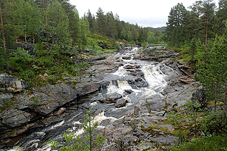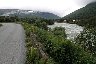 We had a later than usual start as we slept so soundly and a great day's riding (almost all day). The road was very good and the area picturesque. We had breakfast at Folldal and stocked up our food supplies. The first 48 km of riding were slightly uphill as we gained height. We crossed into the Dovre National Park where musk ox are to be seen. Unfortunately we did not see any. Although we climbed back to 1000 m the area was almost all forested and we did not spend much time in the wide open plains. We were following a river upstream all the way and wow, was it full of water! Shortly after entering the park we joined the E6, the primary road in Norway. Our hearts sank when we saw that it was 50 km to Oppdal as it was a busy road with a narrow shoulder, very narrow in places. Luckily for us it was all downhill, but we had a headwind. Although the day was cold there was no rain. We had to concentrate at holding our line so that cars, caravans, campervans and big trucks could sneak pass as there was usually oncoming traffic. I reminded myself that this is what cycle touring in Australia is like, hanging onto your tiny shoulder for dear life. Out of practice I guess. After 30 km of this we stopped for a rest and lunch. We were both tired and felt the stress in our bodies of maintaining speed, direction, no wobble, etc. Tight backs! We had one close call when a idiotvan (sorry, campervan) passed VERY close. Too close. Otherwise all good. We managed to spend about 4 km on a smaller, quieter road, and then although back on the E6 as we had entered the outskirts of Oppdal the speed limit was lower and the road a bit wider so more relaxed. I forget to mention throughout this that the 50 km descent was along an amazing piece of road, rushing down a canyon alongside a raging river fed all the time by waterfalls falling the height of the surrounding hills which in turn were fed by patches of snow and ice. If it were not for having to concentrate on the white line all the way we probably would have taken more in, and more photographs!