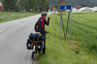 We have a relaxed attitude to morning wake ups now that the weather is so reliable and there's not much point getting to the end of your day early to enjoy sunshine until 11:00 pm and millions of bugs. May as well just take things as they come. So after all the climbing yesterday we were suprised to discover that we would climb almost as much today, not in one big climb but spread out throughout the day. We spent most of the day in the wilderness area and it was very beautiful. You could see for miles around, through coniferous forest to snow covered mountains. Norway is so organised about the outdoors and the facilities are amazing. There are pit toilets in some places, hikers huts complete with fuel and cooking utensils, lean to's and even row boats for use. The lakes in this area offer so much camping, you are spoilt for choice! There are many holiday huts and shacks and most have the earth roofs thick with green grass in typical Scandinavian fashion. The scents of Norway were also on display, think "pine fresh" and you have it, authentically. We saw many herds of sheep on the road today, one bunch in particular was not very keen on moving off the road and a couple ended up chasing us!