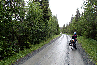 We woke to rain at 6:00 am and went back to sleep. Slept in 'til 8:00 am and by the time we got going at 9:30 am the rain and cloud had lifted a bit. The start of our route at least was visable from the hill where our campsite was! It would be mainly downhill as we had 750 m in altitude to lose. We rugged up as the temperature was only 2 degrees, but after 6 km realised we were too warm and took off the middle layer and were then comfortable. It rained lightly most of the time that we were riding and much of the route was on quiet, unsealed roads through forest area which were a bit muddy and sticky with the rain but great roads otherwise. We did our shopping in the town of Å (!) and then had some climbing to do away from the river in Meldal. We climbed up passed the Svartvatnet lake and a few kilometres further on we came across a perfect little campsite on a river with a bench. Too good to pass up we called it a day, albeit a short one. Tomorrow Trondheim!