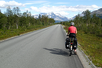 We checked out of the hotel in brilliant sunshine at 12:00 pm and had a fantastic ride. We headed to Breivikeidet, about 50 km away to catch the ferry to Svensby and then from there another 20 km or so to Lungseidet to catch a ferry to Olderdalen. The first leg was along a flat, quiet road that rolled along between fabulous snowcapped mountains with waterfalls running from top to bottom and birch forest. It was a very different ride to any we had had in Norway thus far, more like Finland really if you ignored the spectacular mountain scenery. The next leg was along a fjord with steep scree slopes from the surrounding mountains rushing down to water's edge. We were amazed that this was not also given National Tourist Route status as it was some of the most dramatic scenery we had seen. Not complaining though, as it meant fewer campervans for us. We shopped in Lyngseidet and waited for the ferry in the glorious sunshine, staring into the clear depths of the harbour before us. Arriving in Olderdalen at 6:30 pm we noticed that the place names are now in Norwegian and Sámi and started looking for a bush camp. We found a place a few kilometres down the road where there was access to a river for a swim and also a place to pitch the tent. It looked as if it had once been a sort of holiday cabin place as there were a few numbered wooden cabins in disrepair and a "kioski" building also old and rundown. We pitched the tent quick smart as we were being attacked from all sides by mozzies and horseflies, then rushed down to the river for a quick in and out swim, and then back to the tent before the mozzies caught up. Once in our tent we are safe and feel at home! Looking at the map it was amazing to see how close we are to Finland from here.