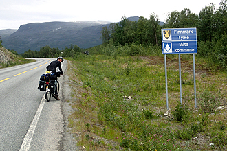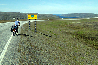 We would recommend this route 100% to anyone travelling by any means in Norway. The road to Nordkapp has it's special attraction of course, but the scenery here was remarkable. We left Kjøllefjord and after the first climb, met the road from Mehamn. We descended into Hopseidet and thereafter climbed up to 346 m above sea level on the Nordkynveg. We descended to the coast again and then the road undulated until Lebesby and onwards to Ifjord. We thought we would find a camp spot along the river at Ifjord, or further on at a lake, but it was not to be. We had no choice but to commence the third climb, on top of which we found a great river which we could camp beside. The day turned out much longer that we had planned because of the camp spot hunt! Other things that happened of interest: on the first climb Mike was approached by a Finnish man in a car who pulled up alongside him and asked to borrow a spanner as his tow bar connection was coming loose! Mike said "Can't stop right now" but flagged him down when the climb eased off and we were able to help with the spanner he needed. Then just before the end of the day passing through a reindeer herding settlement, a husky dog ran out at us wanting to attack me. Mike fended him off. The road that we travelled was completey off the tourist route and very quiet. We loved it! We have only three days left cycling in Norway before we enter Finland.