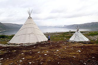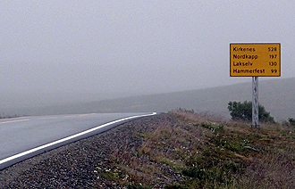 The rain stopped overnight which was promising but started up again just as we prepared to leave and we rode in it all day. Soaking wet! We had a longish climb up to the Finnmark Plateau proper and it was beautiful up there. Some groups of huts, probably reindeer herders, and flat openness all around. We passed a large herd of reindeer as they hung about on the road or crossed it to go up the hill or down to the river. The locals in cars just drop their speed slightly and hoot to frighten them off but they are curious of us on bikes. There were a few high points but nothing over 385 m and then we started to drop down slightly. The views were good, but plenty of cloud cover obscured things. We reached Skaidi and amazingly there was a small open grocery store where we bought a couple of things and they helpfully filled up our water bottles too. From Skaidi it was 22 km to Olderfjord but we would camp short of that along a river where it looked as if we would find a good bush camp. The rain had stopped by now but it was very overcast and we were cold. We stopped to check a few possible camping spots. The advantage of the cold (10 degrees max today) was that the mozzies and their friends kept away. With only 400 m remaining where the river ran close to the road we found a wonderful camp spot right on the river with paths down to it. It was perfect and just in time! The river swim seemed a bit of an effort but we had to do it and then climbed into all our warm gear aned sleeping bags to thaw out. Tomorrow night we will get to the Nordkapp tunnel where we will camp in order to tackle it first thing in the morning when the traffic is at the minimum.
