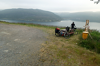 We had no rain overnight and none all day but the weather was really strange, almost as if a summer thunderstorm was about to hit but never did. We had a headwind for the first 20 km as we made up our shortfall from yesterday and then after this the wind was not much of a problem. Alot of the time the waters of the fjords we rode alongside were dead still and the sky was often very dark grey and always overcast. But no rain.