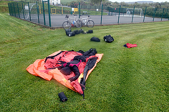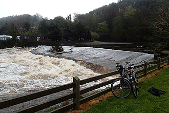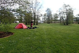 We stopped with about 10 km to go to pick up some buns and eggs at a village store and two men inside exclaimed when we walked in and laughed about the terrible weather and that you only had to look at us to see how bad it was! We all had a laugh. Irish people are very friendly. We arrived at our campsite and immediately noticed two things; there were tents which we hadn't seen many of before, and the river that the site is on was very full and gushing. We pitched our tent on a rise, just in case, overlooking the weir and spent the afternoon and evening marvelling at the determination/quiet acceptance that the Irish seem to have of the rain. It pelted down all afternoon as it had done all day without break, but the people were fishing, walking, riding bikes, etc. KIds and grown ups alike. Some in shorts! We couldn't believe it as the maximum temperature for the day was only 8 DegC! As we checked in, in fact, a lady came into reception to hire two fishing nets and she and her little kid set off in the mist and rain to play about. We stayed in our tent all afternoon, which seemed more sensible.