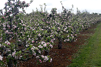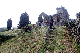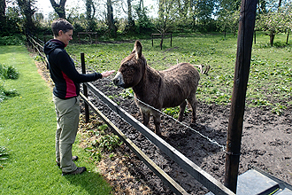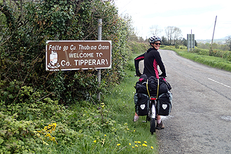 POURED with rain all night long so at 6 am we had a chat about if it is still raining like this at wake up time we aren't going ANYWHERE. It was, but it was lessening, and by 8:30 am it had cleared. We had had a bit of a sleep in and hit the road at 9:30 am. If it's not raining, no excuses! The route was great once again. We bought some delicious yoghurt for breakfast after about 15 km and then had to put on wet weather gear as it started to rain. We eventually got to eat at the 35 km mark, in Carfrick-on-Suir. The riding had been good and along very pretty, quiet roads, but we were wet! We stopped on the main street to figure out where to sit and eat and a helpful passerby asked us where we were heading. When I asked if there was a bench where we could sit and eat he replied "Your best bet is to turn right at the Sunnyside Bakery and go to the Heritage Centre, there's a bench among the old gravestones". He was right! It is a pretty little village. After this the rain really came down and we were in wet weather gear for the rest of the day. Apart from the rain it was a good day's riding. The campsite at the end of the day was the real highlight, and it was one we had not had a chance to research, it was just on the GPS as a campsite. It is called the Apple Farm and is a most beautiful apple orchard, at this time of year all blossoms in bloom and we received a lovely warm welcome. There was a donkey (Mike was quite excited about Donk as we had not seen one yet on our travels; no cycle tour is complete without one) and a wonderful farm shop where you could buy any type of apple and all kinds of juice, jams, etc. On top of this we were given a complimentary bottle of fresh apple juice! How kind! The camping area was lovely with a few caravans and quite informal. Also, hot (free showers), indoor seating, etc. etc. Our perfect campsite!