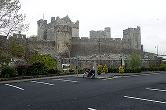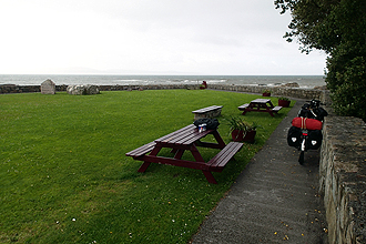 At first we planned to ride 60 km but changed the route at the start to take in the castle at Johnstown which added 10 km into the day. We used a cycle route for most of the day. Ireland does not have designated cycle routes like the UK (and is probably the better off for it!) but there were two routes marked today which we used. It was quite cold but no rain and quiet due to it being a public holiday. After about 50 km we crossed a river mount (Passage East) via a short ferry with a largish group of road cyclists out for a weekend ride. Due to their numbers we weren't charged for the trip as they had already paid on their outward journey. We also had good chats to some of them while waiting, and on the ferry trip. After the ferry we had some small hills to climb to Tramore and arrived at our campsite which consisted mainly of demountable cabins for hire as many of the seaside towns do. Our hosts were friendly and accomodating, even bringing us a bench to use and additional shower tokens as we had showered when the hot water had been off, so the showers were distinctly luke warm! We took a walk along the promenade (like many others as it was a good day with sun here and there). We were told to expect rain overnight so were in bed early, not wanting to take any chances.