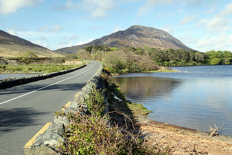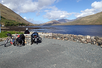 Super duper to wake up to clear skies and no wind! We continued through the Commenara region today and stayed on the main road which was quiet and passed through beautiful countryside. It was a shorter day today as we were to stay in Westport, which was appreciated after the long day yesterday. This gave us the afternoon to relax! We breakfasted in Letterfrack and then passed the beautiful Kylemore Abbey. This is a big tourist attraction and is an old stately home that became a school and has famous gardens to view and still operates as an abbey. At its entrance gates, you couldn't see it from the road, but shortly after passing we got a clear glimpse of the buildings over the water and it was very beautiful. It was such a joy to be riding in good weather! We stopped for coffee in Leenane. We were back to spectacular today, surrounded by high hills and even mountains. Once again parts of the day's ride felt very remote. Leenane is on the banks of the Kilarney Ford and the area is very beautiful.