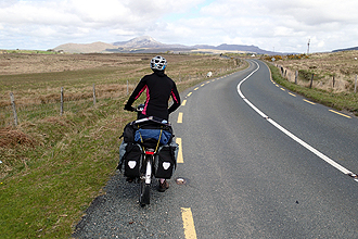 We woke to light rain on the tent and rode in wet weather gear for quite a way. We had a lovely greenway cycleroute out of Westport all the way to Newport (16km) and breakfasted there. We then skirted the foothills of the mountains to Crossmolina where we had coffee, and then lunch at Ballina. Lovely day's riding today. After Ballina we followed the coast to Enniscrone where we camped. We were pleased to have had a good meal at Ballina as Enniscorne did not have much available. In the evening we took a walk along the beach and promenade which was nice. We are aiming to reach Belfast in three days from tomorrow but it will be a tall order. We'll see how we go!