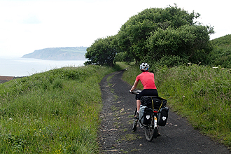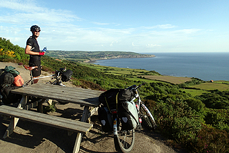 Eventually things started to become less trying and we crashed down the last hill on a rough track and into the valley of the River Esk. Under the railway bridge and then our final 20% warning when we gratefully hit the Cinder Track, a railtrail that would take us all the way to Scarborough tomorrow! This was also Route 1 again; the North Sea Cycle Route, and afforded us wonderful views of the peaceful North Sea. We soon reached Robin Hood Bay and then our campsite. We walked down into the tiny village through a pretty forest and bought fish and chips and black pudding, sausage and peas which we ate at the small harbour. There was some rain later but we were relaxing in the tent. Only 147 km left to ride in the UK! Can't believe it. Hull in two days!