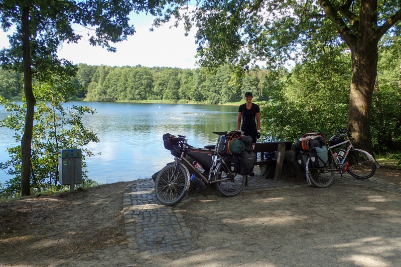 We were soon at our campsite, without suffering any allergic reaction. It was, as expected, huge and German. On a lake, 450 pitches. All the bells and whistles, but grass bone dry and brown from the recent heat. We are paying EU 30 for the pleasure. No cyclist rate here, even in a country that is well-known as a cycle touring destination, or at least known for bicycles! We did find a shady spot though and took a walk later. It was interesting to see two water skiing devices with no motor boat required. There was a huge rotating cable pully device above and each person grabbed onto a rope by a handle and was whirled round and round. Sort of like a ski chair lift, but for water skiing. We were amazed! Tomorrow we are going to try to get all the way to Bremen. We are enjoying the weather now, it is cool but comfortable.