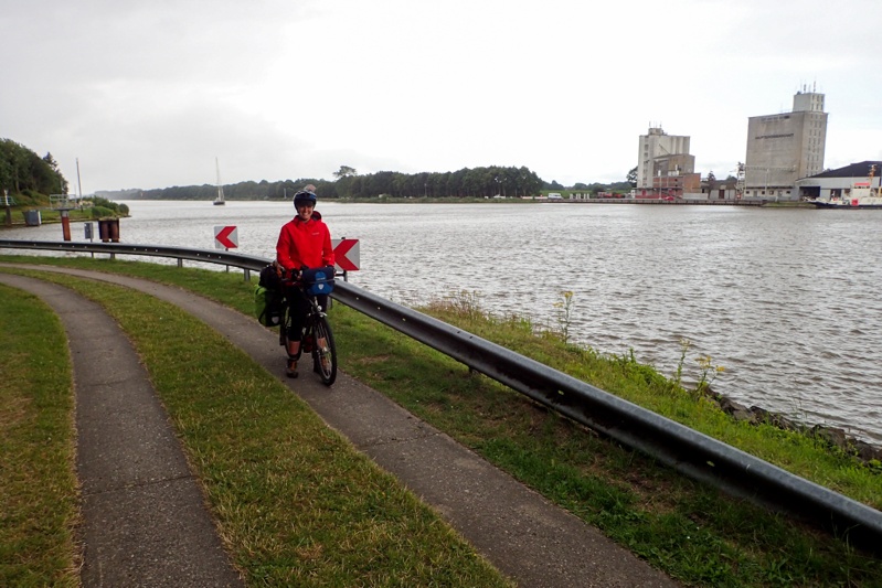 The last 25km of the ride was along the Nord-Ostsee-Canal and we caught a ferry over this, the 25th ferry of the tour and then had a few kilometres to go to our campsite. We stopped briefly at the village butcher for some salami. The campsite is on the Eider River and is quite informal. There are some other tenters, two of which are cycle tourists. I forgot to say yesterday that we saw our fourth robotic lawnmower and clocked over 5,000 km for the trip so far. Also, Mike did some field maintenance on the bikes in replacing the Rohloff oil.