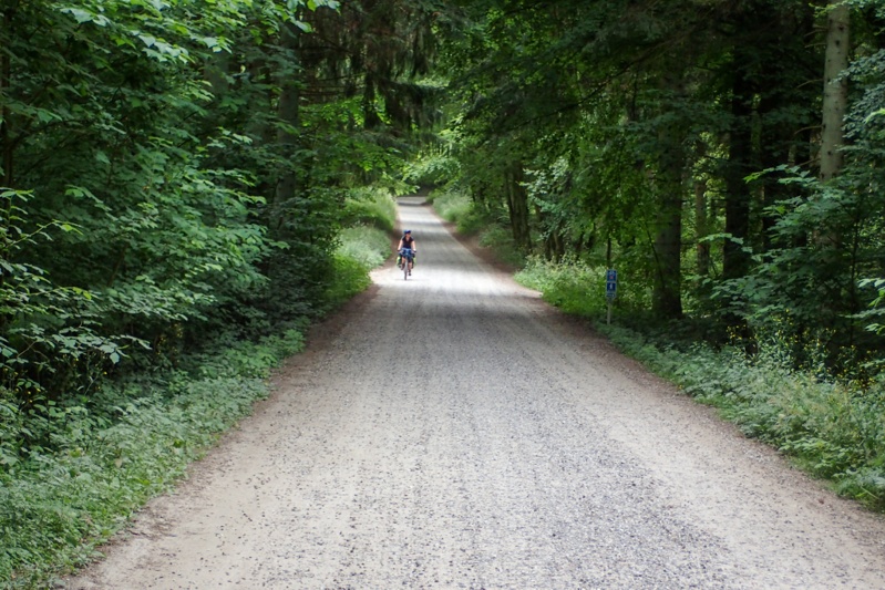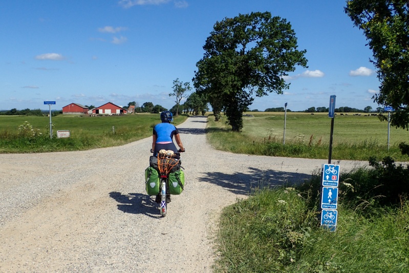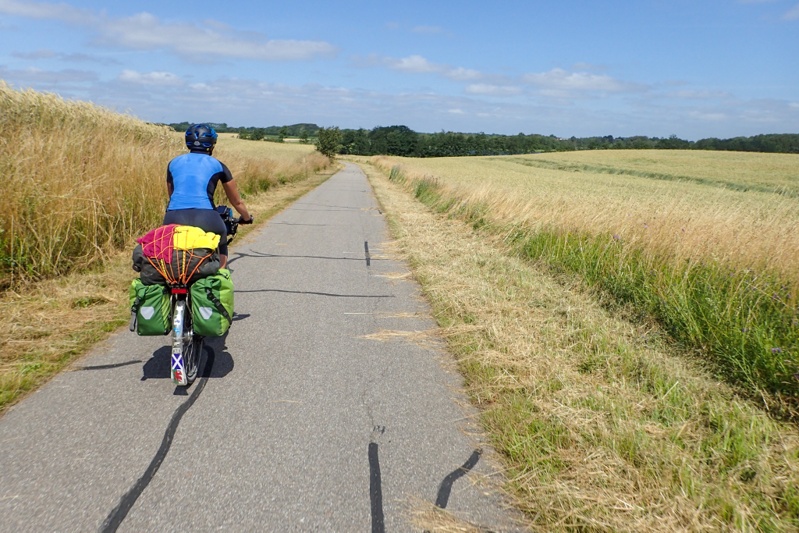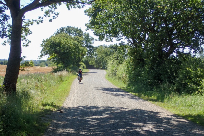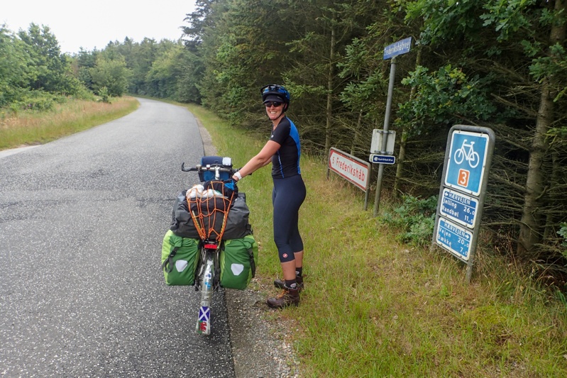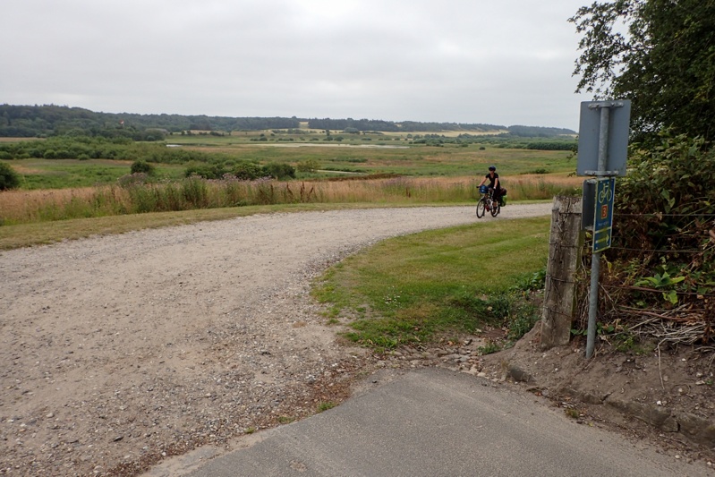 We started our ride through the beautiful Rold Skov woods near Arden and checked out the amazing shelter place they had there. There are little wooden shelters for sleeping in, with lovely forest views and toilet and drinking water, as well as the lake close by. All free camping. There was a lady sitting at the opening of her shelter, knitting in the morning sun! The route through this section was very pretty and we stopped quite early in the day for coffee and buns in a meadow with our first Danish sheep! After this our beloved H??rvejen took a turn for the worse, going to very rough gravel walking track and finally deeply-rutted single track, where I fell off my bike, no serious damage done fortunately. After this we went through various stages of hating H??rvejen throughout the day. The route just really changed today, the scenery was still lovely, but the route was mainly on very bad off road surfaces. Aarborg, a big town en route today, had a bad entry into it on these rough little roads for cyclists, and once we were in there it was not cycle-friendly to navigate. There were a lot of roadworks which didn't help. We were happy to leave.