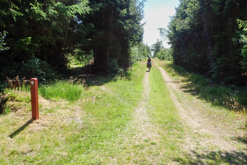 Today was not completely flat, as has been the norm since arriving in the Netherlands, but that was interesting too. No climbs or anything, just small uphills. We saw our 5th robotic lawnmower of the trip. We stopped with only 8km to go to buy food and to eat as we were hungry. Our campsite was only 1 km on other side of the German-Danish border. We are going to explore Denmark's network of dedicated primitive camping spots. There are hundreds of these throughout the country and they come with different facilities. Some are only a clearing in the forest, some have a shelter, some have a toilet or drinking water or firepit. So they are basic and that suits us perfectly. It does not cost anything to use them. It is Denmark's answer to the Right to Roam of other Scandinavian countries. Unlike those countries, Denmark is very built up and does not have large natural areas. These campsites will be perfect if they work out which we are sure they will as if you don't like one, well the next one is not far away. For this one tonight we knew there was no drinking water so made sure we were full of water when we left. Then in the town where we shopped we noticed that Edeka supermaket had a toilet so we could fill up our shower bag in the basin there. With only a short ride to the campsite, this was not difficult for Mike to carry on the back of his bike. We arrived at the campsite and are the only one's here, which we would expect. It has benches and even a shelter and is in the forest. It is a beautiful spot. The only other person we have seen was one dog walker. We have had a very relaxing afternoon.