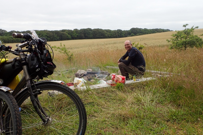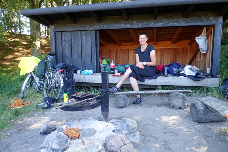 Wow, very quiet night on the forest floor last night. Today promised to be sunny which was a relief as we needed to wash our cycle clothes and SOCKS especially! It was an interesting ride today, through a variety of landscapes from rural to forest to moorland. We even had a few steepish climbs (up to 9%)! Could not believe it was Denmark! Nice riding. We were pretty excited about our decision to have a BBQ tonight! Most of the primitive camps have fire pits and so we had bought a disposable BBQ yesterday. Our experience in Finland has been that often there was wood provided to use, but it is always good to have one of these babies as a back up. We decided to use the same philosophy in Denmark. We stopped to buy meat (some sort of neck chops, turned out to be pork, very nice) as well as toasted sarmie makings to road test our new Light My Fire closed grids. We got some Aromat salt to drown everything in and of course marshmallows for desert!