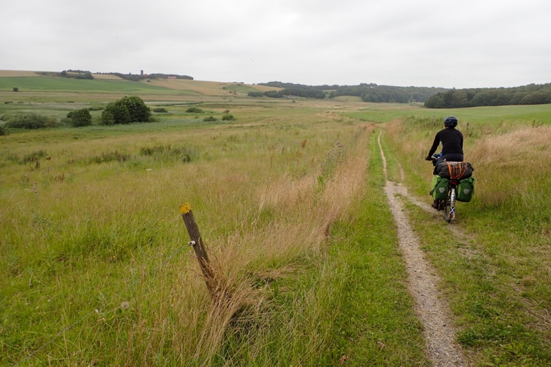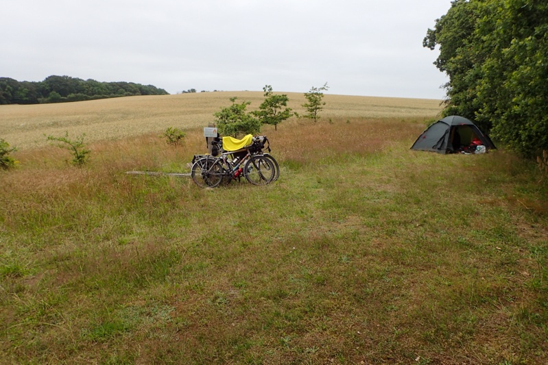 Our camp is in the coolest spot, on the edge of an oak forest along a wheat field. With a sunny afternoon on the cards we chose a grassy bank overlooking the wheat. Mike had a walk to fill two water bags at the nearby stream and then I went after to do the "washing" of the cycle clothes. I use the term loosely as dousing socks, gloves etc. that have been used for a week in 5 L of river water once or twice does not a laundry-woman make, but better than nothing! After this is was 17:00 and of course it had clouded over so we can only hope everything dries by tomorrow. Of course we have more than one pair of cycling clothes, but carrying wet gear on the back of the bike looks unprofessional!
