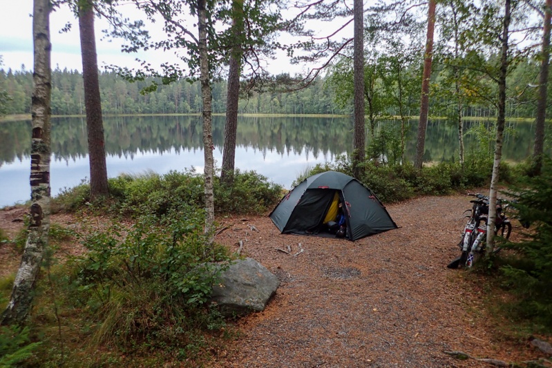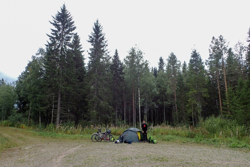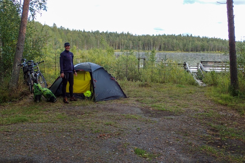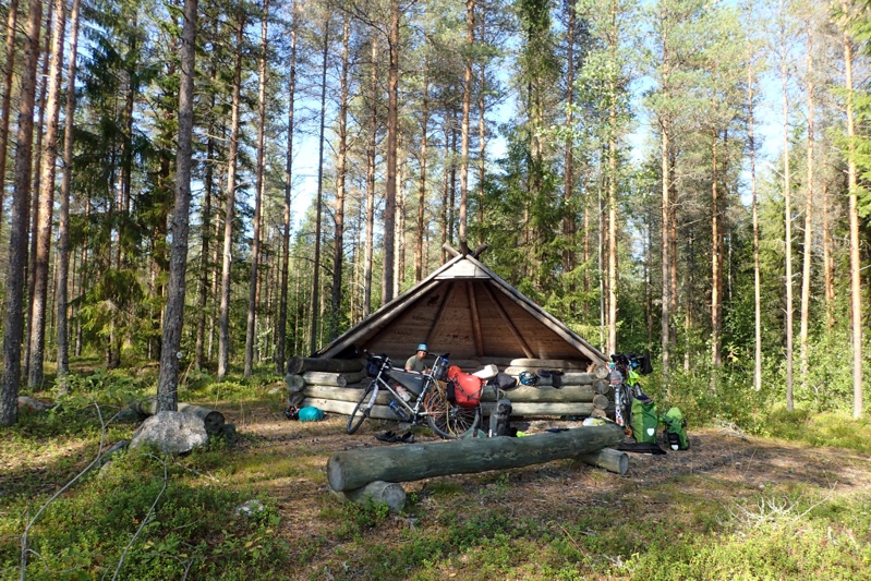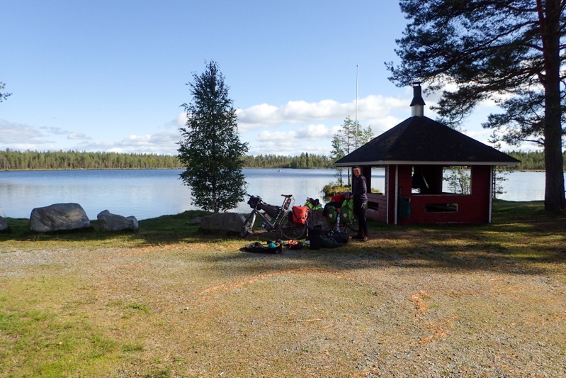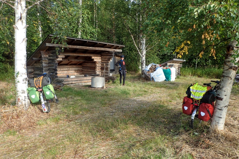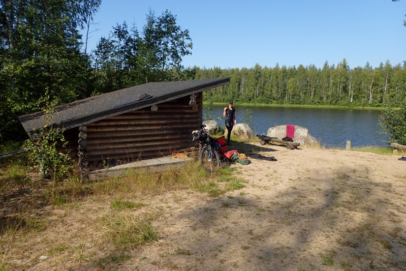 We got to our laavu before Ranua and as it was a way from the water we rode down there first to have a swim and then came back. We met a man collecting berries. He showed us his haul which looked good to us but he seemed disappointed. The laavu does not have the usual bells and whistles i.e. wood store and toilet. It is small and looks to be just for locals on the nature walk that passes here. Good enough for us though! We were both exhausted and pitched the tent and had a sleep for over an hour. As we woke up a couple came walking past and gave us the thumbs up! We hope we feel better tomorrow.