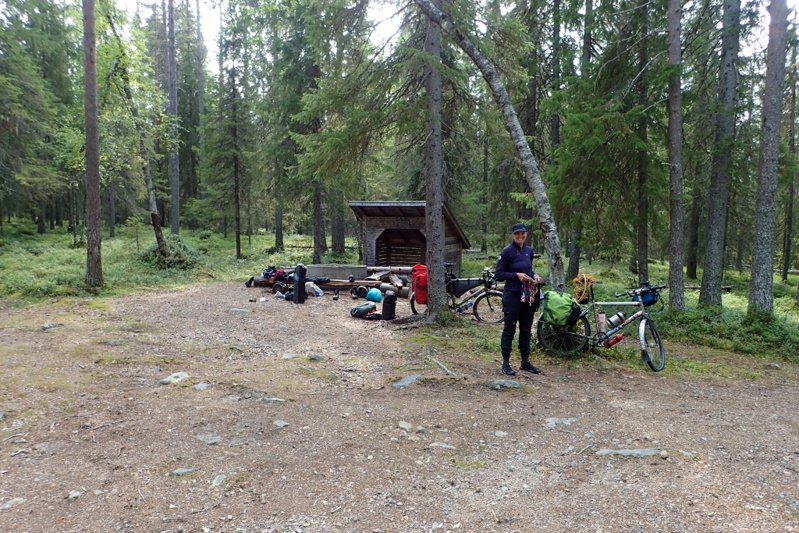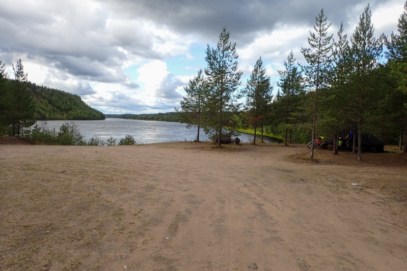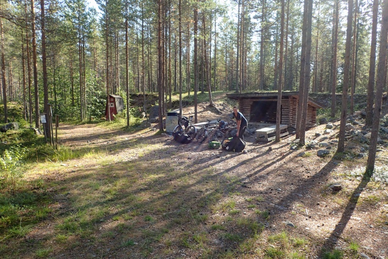 We continued and rejoined the 79 to the big town of the day, Kittäne. We stopped to shop and bought a delicious warm lunch at the K-Supermarket. I suddenly remembered that many of the supermarkets sell warm food so we had delicious potato bake and roast chicken. After this we had 15km to go to our "keeping the faith and all our fingers crossed" laavu. It was shown on an information map by the roadside also so we were optimistic. We turned down at the shooting range on a gravel track and then rode through the shooting range (open air!) to the river where a brilliant site awaited us. Perfect laavu, pretty new pit toilet (you know it's new when you look inside and can't see the bottom!) and massive wood store. You feel so looked after on a trip when you come across this sort of thing! We had a cold river swim and got a fire going. It turned out to be a very sunny afternoon which was good for charging some things with our solar panels (they have been out of work lately). We were driven into the tent in the early evening by the damn sand flies again. They are a total pain, but you can't do much about it.