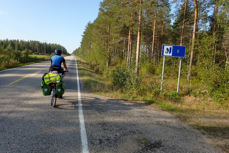Riding in Finland is pretty easy. You just seem to roll through forest without much effort. Each time we came to a village or settlement we had a fabulous bitumen cycle path. At one of these villages we had the company of a dog who appeared galloping along beside me and would not be dropped even by Mike, pushing out 30kph speeds. The dog just ran alongside, faster and faster. This continued for over five kilometres until we hit a slight downhill and just pushed as hard as we could and left him behind. Muonio was the town of the day where we would buy food. It was a pleasure spending Euro again, the numbers are easier to deal with!